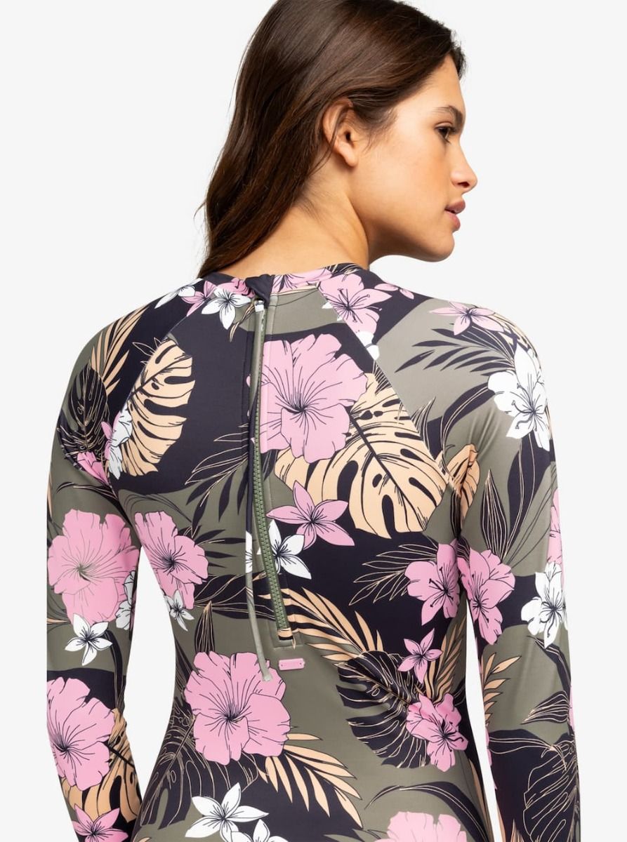 Su práctico diseño incluye un cierre trasero de cremallera para facilitar el cambio, el cuerpo completamente forrado garantiza una cobertura óptima, mientras que la manga larga y el cuello redondo te protegen del sol y de las rozaduras con la tabla. También cuenta con una placa de goma ROXY cosida en la espalda.