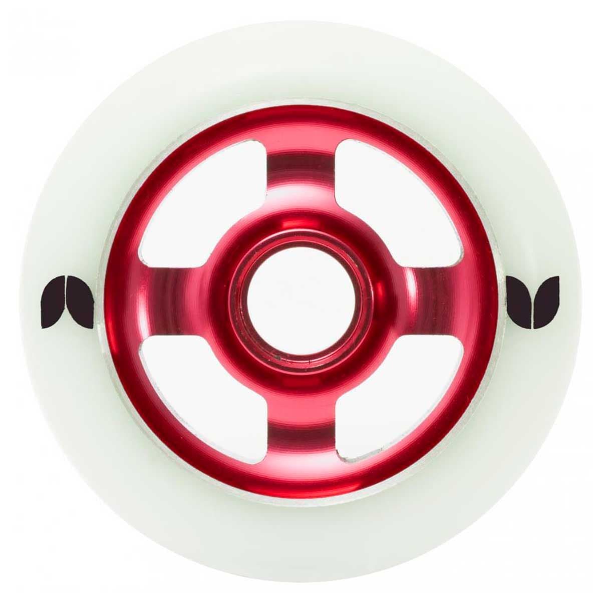 Esta rueda de patinete cuenta con un diámetro de 100mm, núcleo de aluminio anodizado rojo, neumático blanco de PU de alto grado con 88a de dureza, serigrafiado de Blazer "Tulip" y un peso por unidad de 191g.