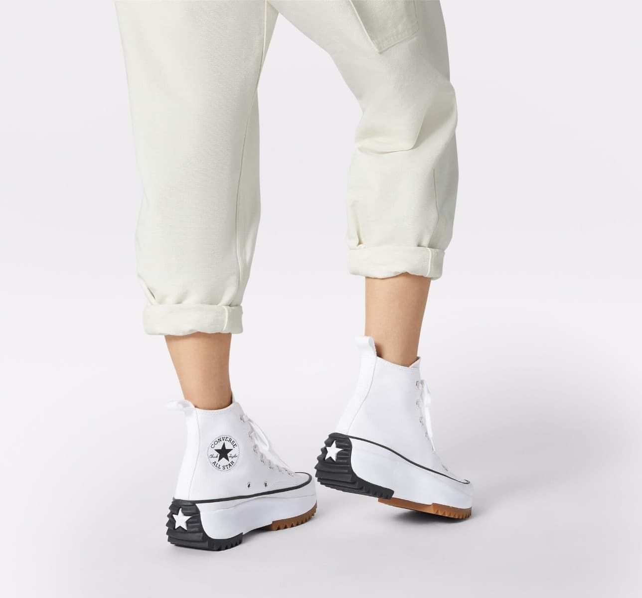 Las Converse Run Star Hike Platform Canvas High Top en color blanco llevan el ADN clásico de las Chuck Taylor a un terreno más contemporáneo. Este modelo unisex combina los elementos icónicos de Converse con una plataforma elevada y una suela dentada que transforman por completo su silueta, manteniendo la versatilidad para el uso diario urbano.