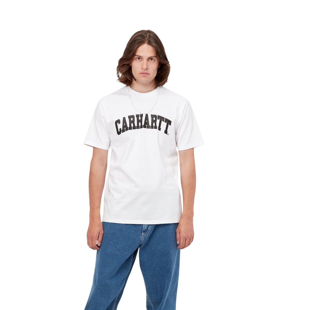 Esta camiseta blanca de ajuste regular cuenta con cuello redondo, manga corta y el logo de estilo universitario Carhartt impreso en negro en la parte delantera.