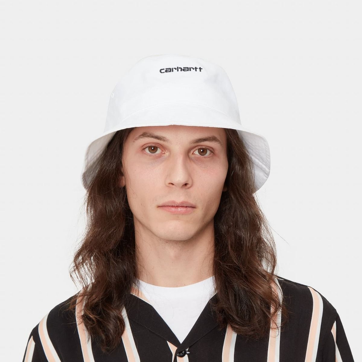 El Script Bucket Hat está disponible en blanco con el logo de Carhartt bordado en negro (White/Black).