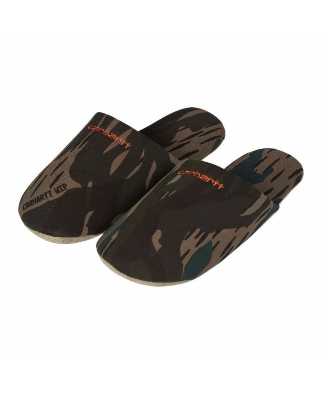 Las zapatillas de andar por casa Script Embroidery Slippers Camo para hombre tienen el logo de Carhartt bordado.