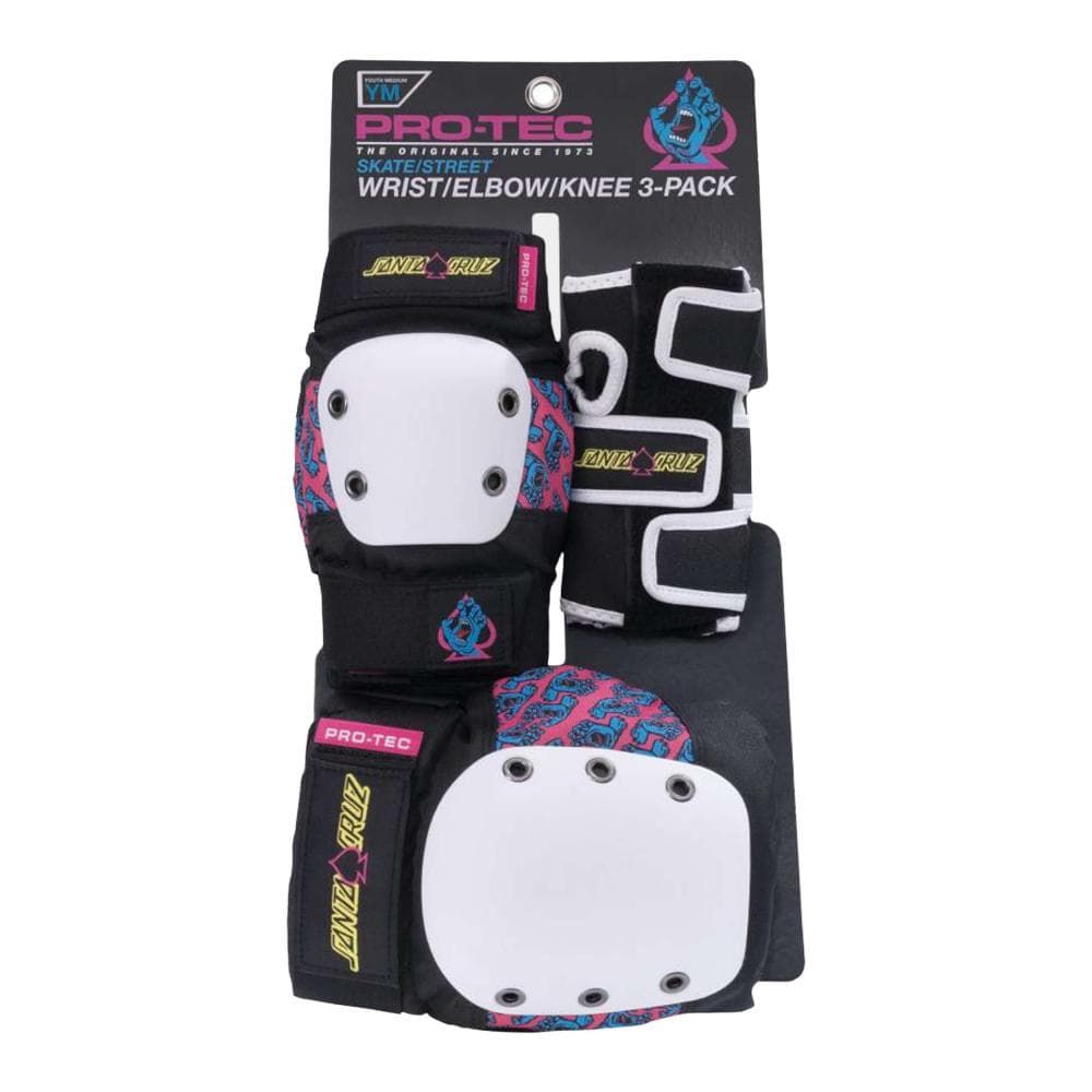 Set Pro-Tec x Santa Cruz Street 3 Pack Black/White/Pink con rodilleras, coderas y muñequeras. Protección EVA + ABS con diseño Screaming Hand.