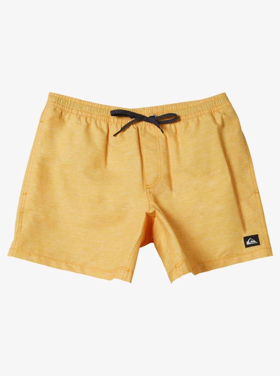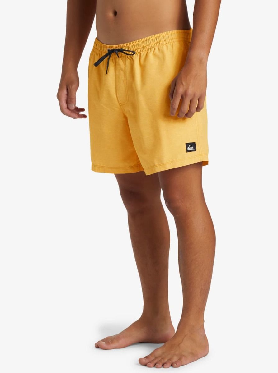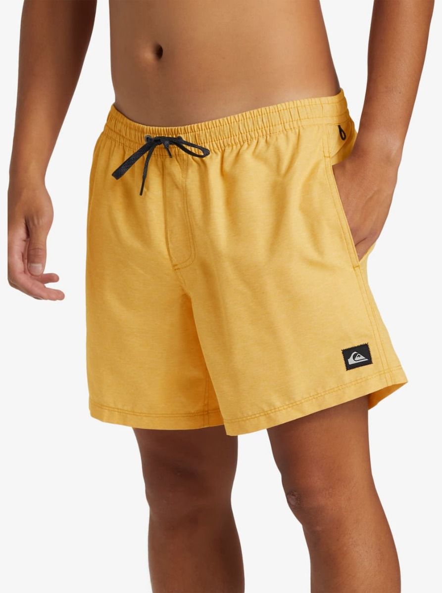 Este short de natación de diseño monocolor amarillo, perteneciente a la Colección Everyday y Made Better de Quiksilver, cuenta con calzoncillos interiores de malla, cintura elástica, cordón de ajuste, pierna recta, 38cm (15") de largo, bolsillos laterales, bolsillo posterior con cierre autoadherente de velcro y agujero de drenaje, un cordón elástico para las llaves en el interior del bolsillo y un parche de tela con el icónico logo de la ola y la montaña tejido en la pierna izquierda.
