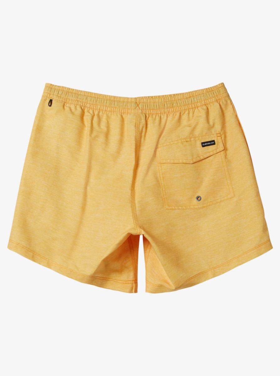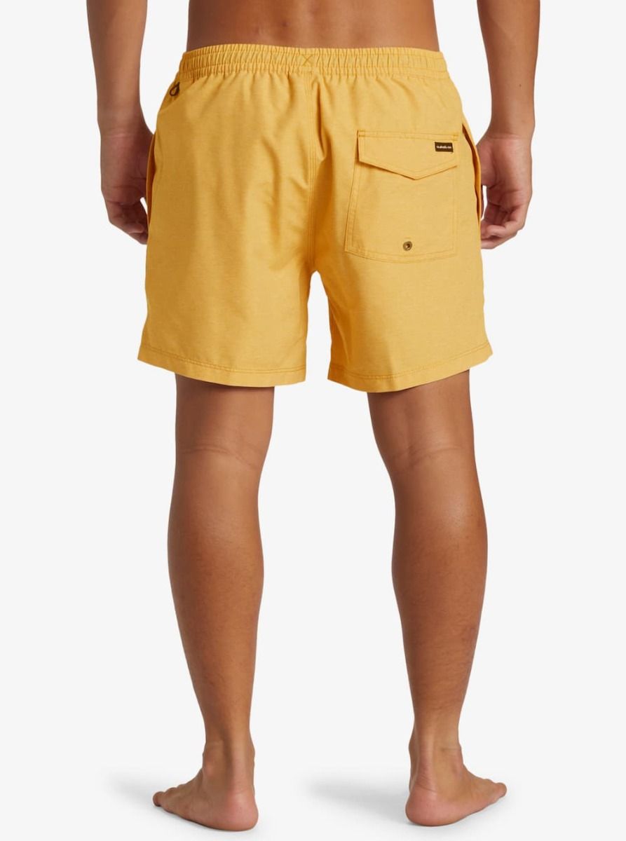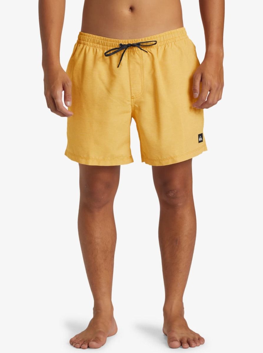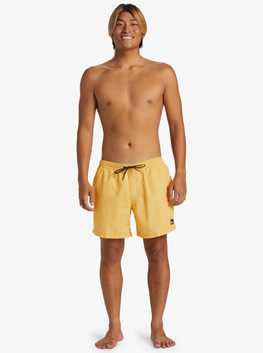 Este short de natación de diseño monocolor amarillo, perteneciente a la Colección Everyday y Made Better de Quiksilver, cuenta con calzoncillos interiores de malla, cintura elástica, cordón de ajuste, pierna recta, 38cm (15") de largo, bolsillos laterales, bolsillo posterior con cierre autoadherente de velcro y agujero de drenaje, un cordón elástico para las llaves en el interior del bolsillo y un parche de tela con el icónico logo de la ola y la montaña tejido en la pierna izquierda.