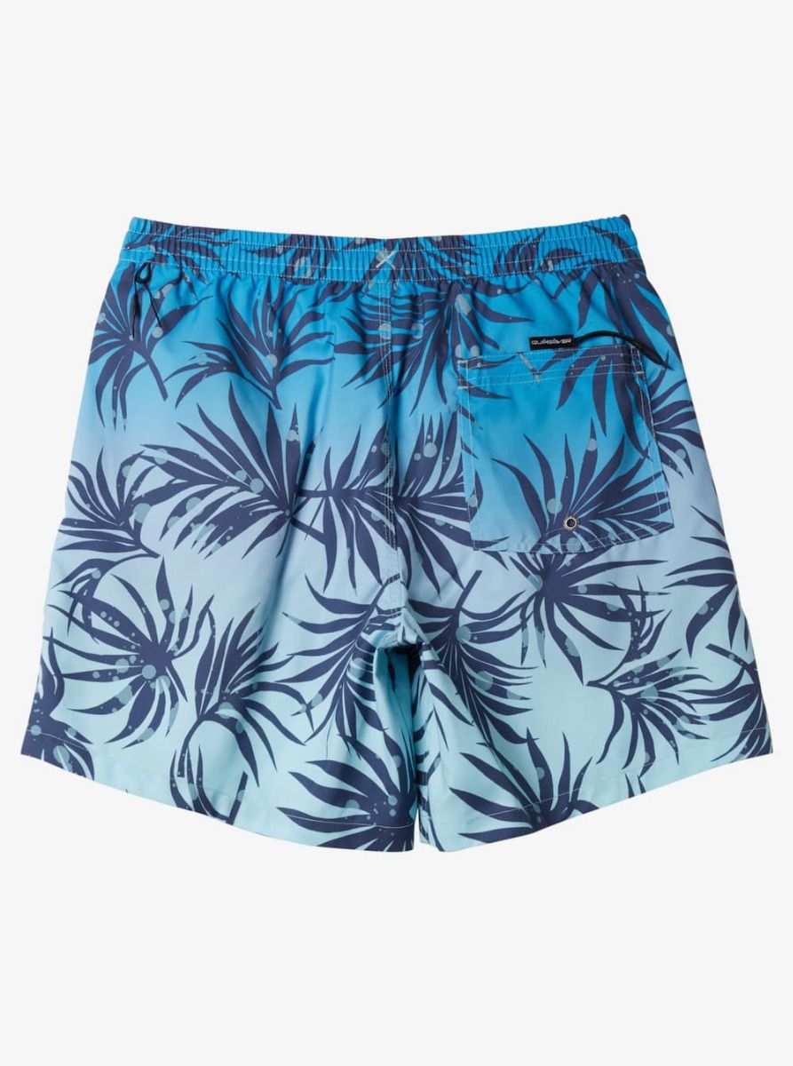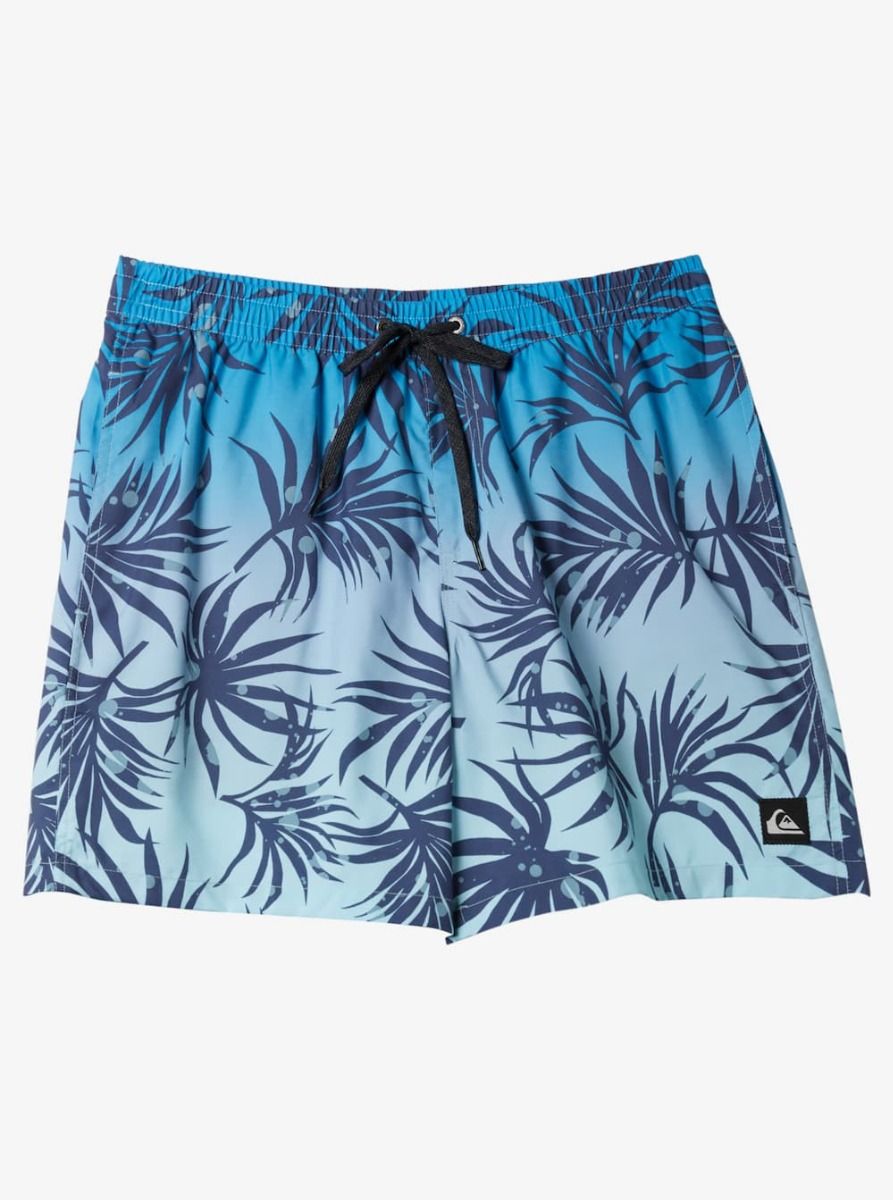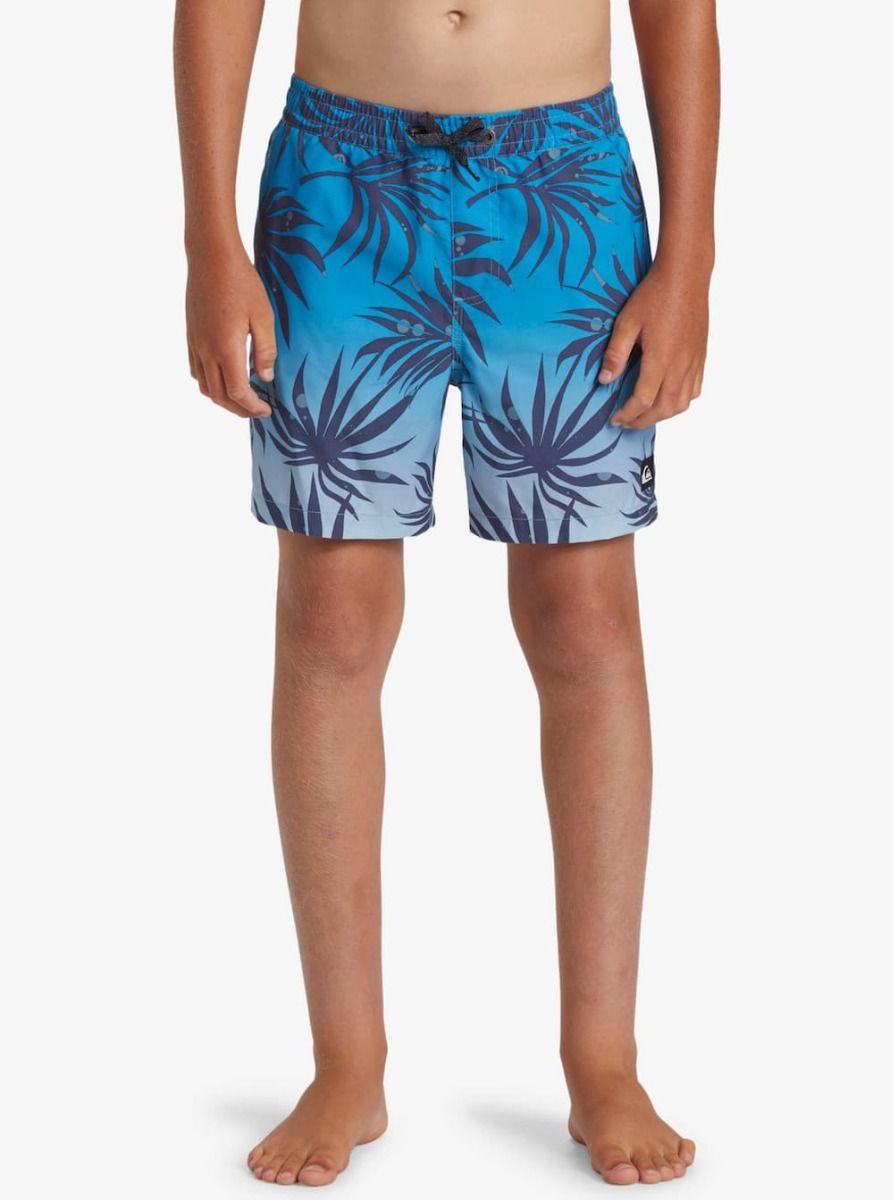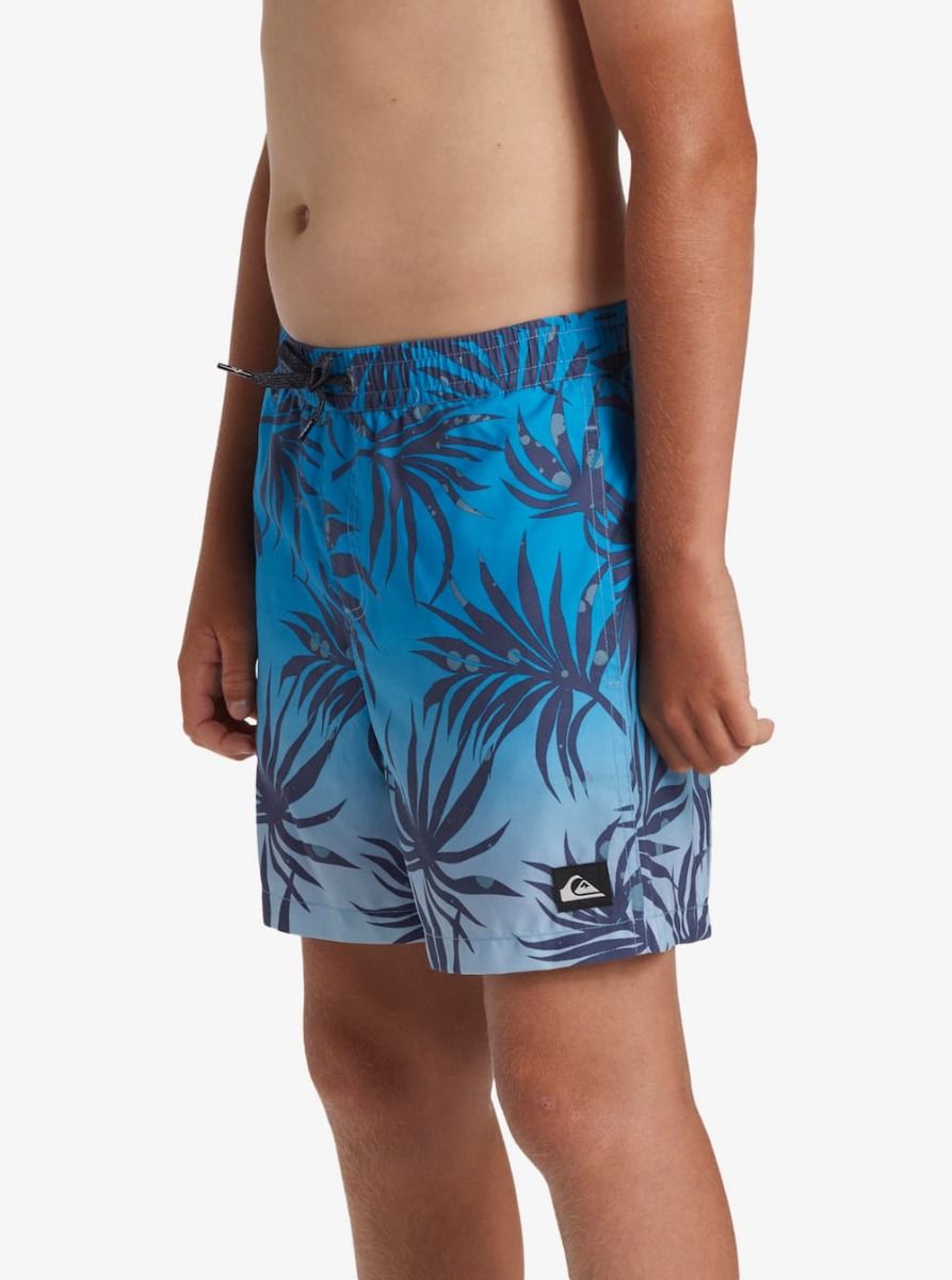 Boardshort corto Quiksilver para niño con estampado degradado tropical en tonos azul Blue Fog. Comodidad, ligereza y tejido reciclado para disfrutar del agua con estilo.