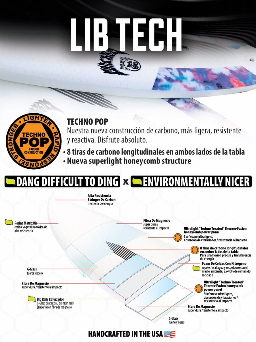 La tabla de surf Puddle Jumper HP 5'10" 36L cuenta con la nueva Contrucción Techno Pop de carbono más ligera, fuerte y con mayor capacidad de respuesta y con el sello Lib-Tech EcoImpacto, por lo que está fabricada a partir de materiales de alto rendimiento sostenibles y mediante procesos respetuosos con el Medio Ambiente.