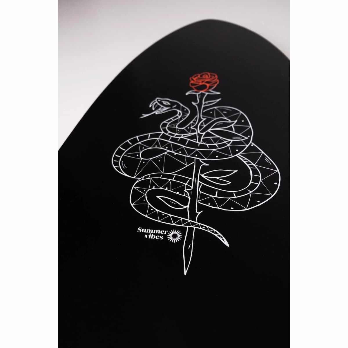 La superficie negra mate presenta una impactante ilustración geométrica de serpiente enrollada en torno a una rosa, una imagen potente que combina elegancia y fuerza. El reverso, en madera natural, lleva una rosa roja serigrafiada como detalle minimalista.