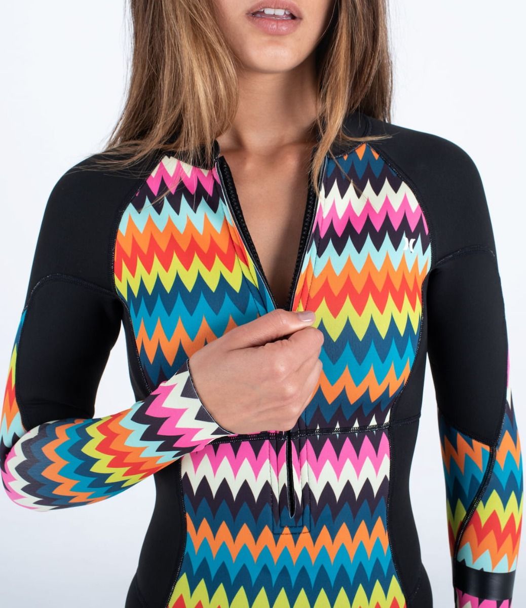 Este clásico neopreno Hurley para mujer de entretiempo cuenta con 2/2mm de grosor, ajuste normal, manga larga, cremallera frontal, cinta colocada estratégicamente para mayor durabilidad, estampado de colores, rayas Block Party negras en el brazo izquierdo y el icono de Hurley serigrafiado en la espalda y en lado izquierdo del pecho.