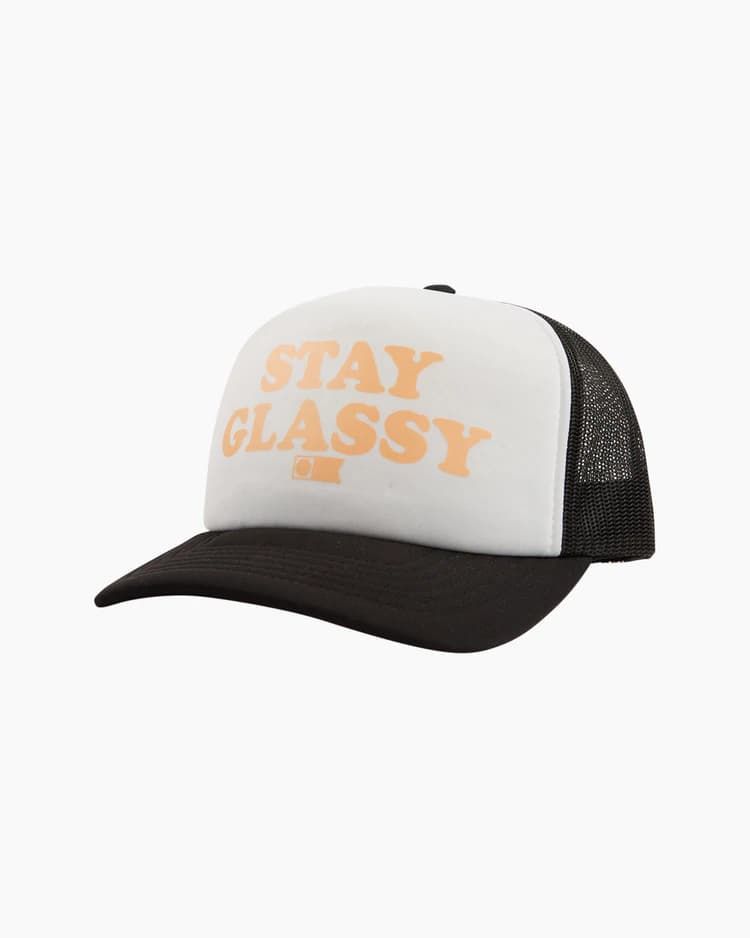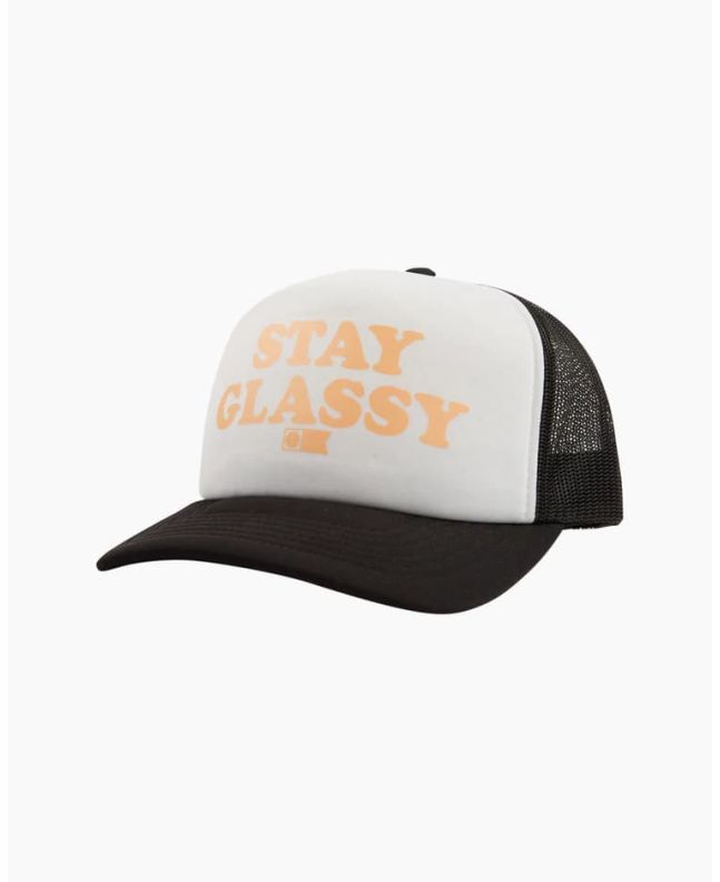 Esta gorra trucker estructurada en 5 paneles cuenta con parte delantera de espuma, paneles laterales y traseros de malla, visera plana, altura media, cierre ajustable posterior con broche a presión de plástico y el logo de Salty Crew y la leyenda "Stay Glassy" serigrafiados en el frontal.
