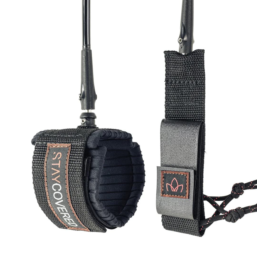 Este leash 9' de olas grandes color negro presenta correa de poliuretano extruido con 8mm de grosor, un puño más ancho, salva-cantos, a la vez que menos estiramiento y un agarre más fuerte que los leash de la gama estándar de Stay Covered.
