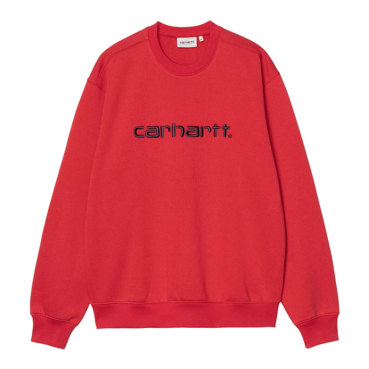 Esta cómoda sudadera básica en intenso color rojo cereza (Cherry) presenta ajuste holgado, tejido cepillado para proporcionar un aspecto de forro polar, cuello redondo, puños y cintura acanalados, junto con el logo de Carhartt en texto bordado en color azul espacial (Space) en el pecho.