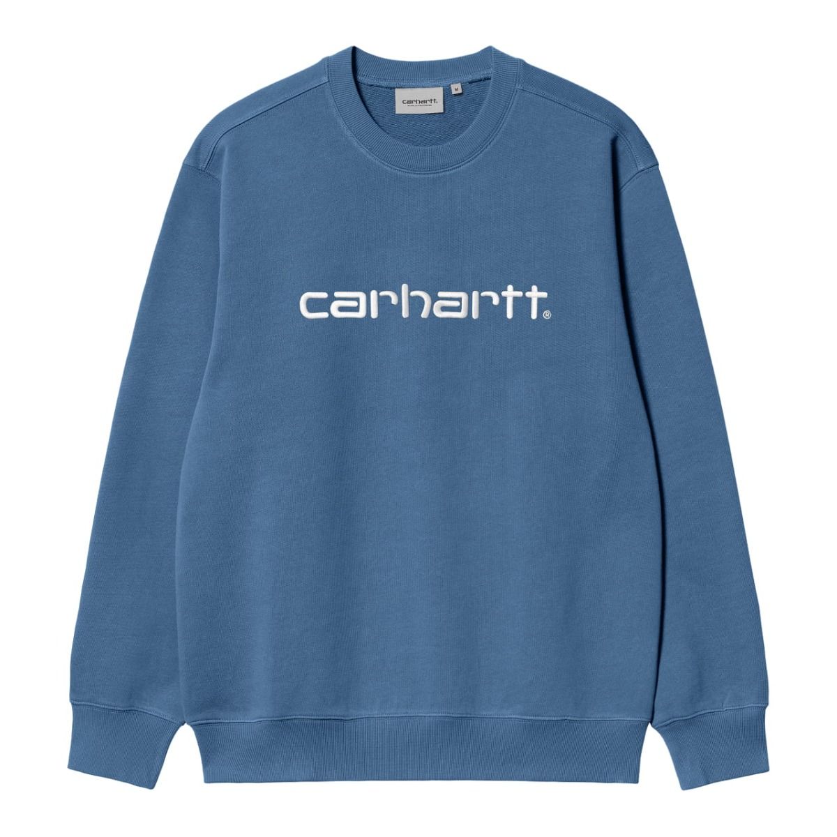 Esta cómoda sudadera básica azul de ajuste holgado cuenta con tejido cepillado para proporcionar un aspecto de forro polar, cuello redondo, puños y cintura acanalados, junto con el logo de Carhartt en texto bordado en color blanco en el pecho.