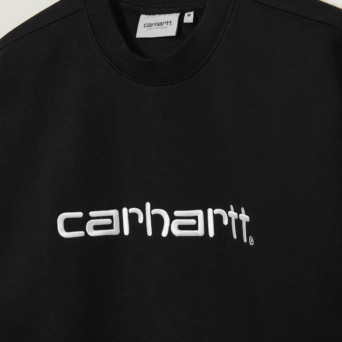La sudadera Carhartt Sweatshirt negra y blanca para hombre tiene una etiqueta de garantía Carhartt Work In Progress en el cuello interior.