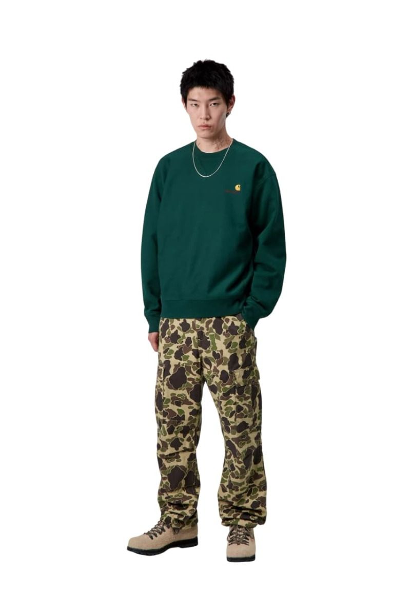 La Carhartt WIP American Script Sweatshirt para hombre en tono verde (Dark Fir) es una sudadera pensada para quienes buscan una prenda versátil, de tacto suave y con un acabado premium típico de la marca. Diseñada para el día a día dentro del universo workwear moderno, ofrece una combinación equilibrada entre comodidad, resistencia y estética clásica.