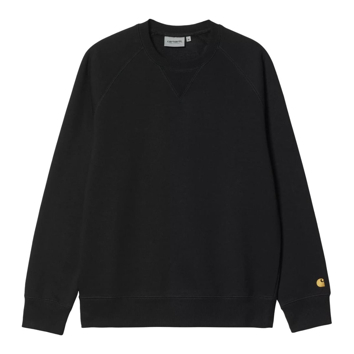 Esta sudadera clásica negra sin capucha de ajuste regular cuenta con mangas raglán, costuras flatlock, cuello redondo, puños y cintura acanalados, junto con el logo de la "C" Carhartt bordado en dorado en la manga.