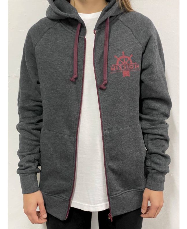 Este hoodie de corte regular cuenta con capucha con cordón ajsutable, amplio bolsillo tipo canguro, cierre de cremallera frontal completo y el logo de Mission de inspiración marina estampado en el pecho y la espalda con la leyenda “Mission Pontevedra Since 2002”.