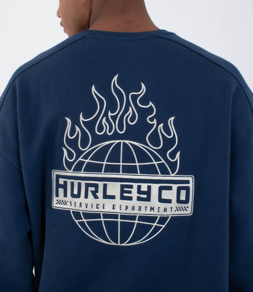 El gráfico “Hurley Co – Service Department” bordado en la espalda con llamas sobre un globo terráqueo, aporta ese toque de diseño potente y callejero que eleva el conjunto. En el pecho, el mismo emblema aparece en formato mini para equilibrar el look sin perder fuerza.