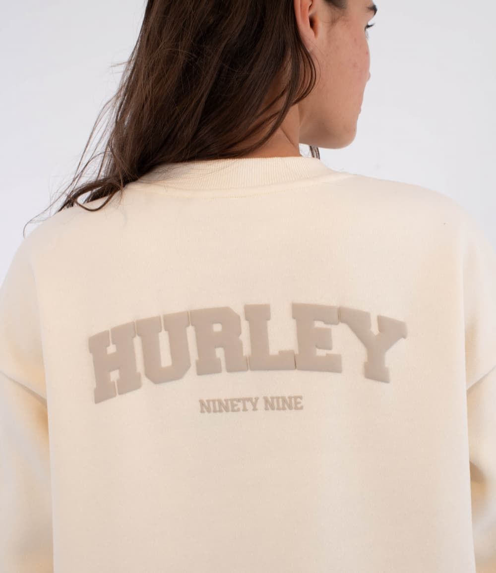 El logo HURLEY aparece con efecto acolchado en el centro del pecho y en la parte trasera, acompañado del texto "Ninety Nine", en homenaje al año de nacimiento de la marca. El resultado es un diseño limpio y elegante que no pierde la identidad surf urbana que caracteriza a Hurley.