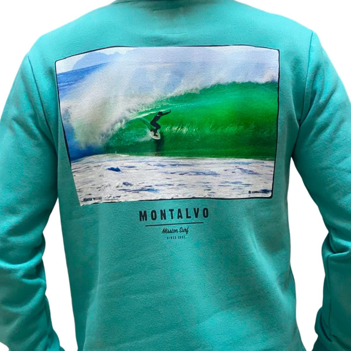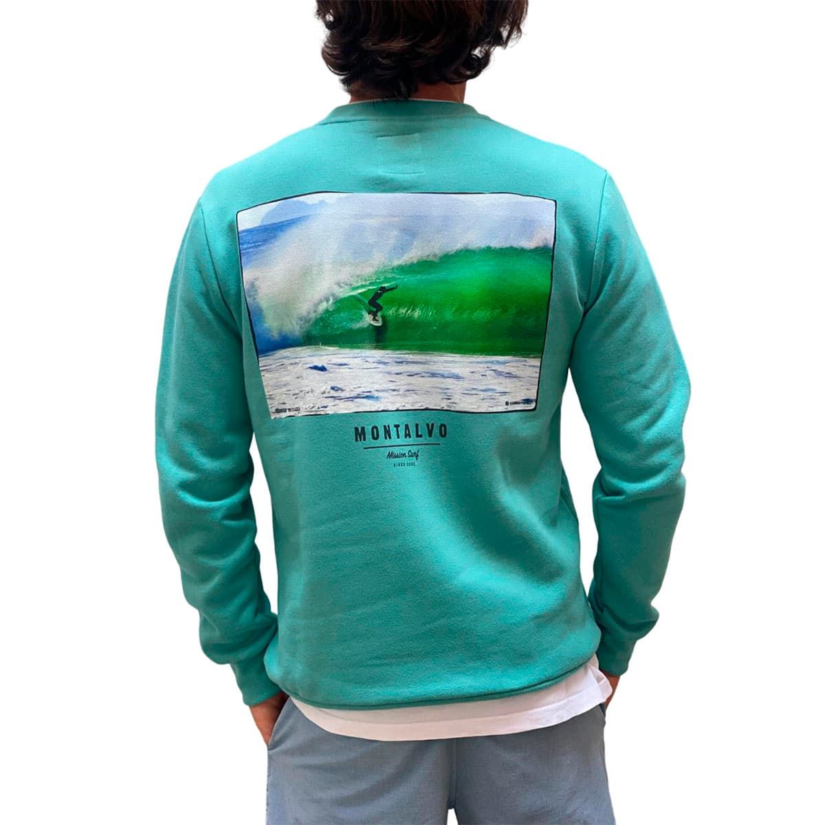 Saca tu lado surfer con la sudadera para hombre y mujer Mission Pocket Crewneck Logo Montalvo en un relajante tono verde turquesa (Jade). Esta prenda unisex es perfecta para los amantes del surf y la aventura, con un diseño inspirado en la Playa de Montalvo (Sanxenxo).