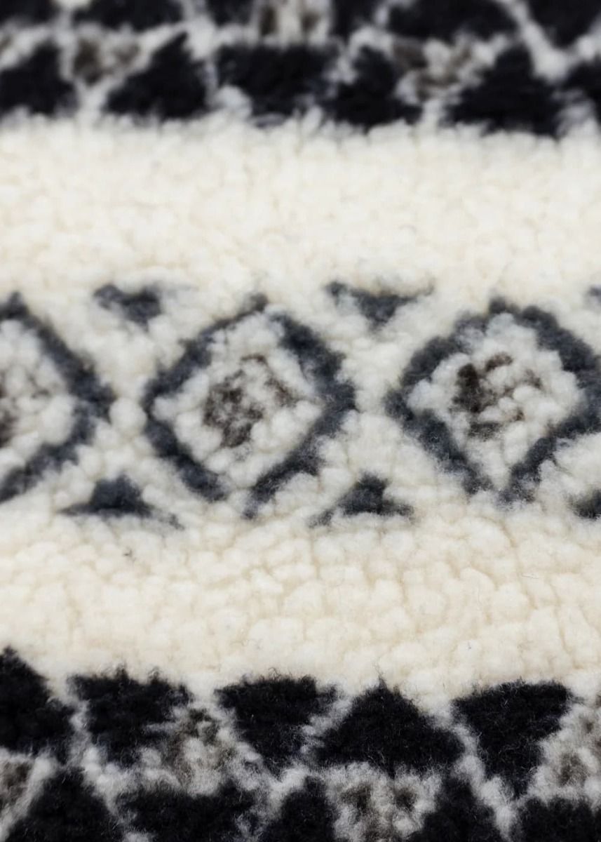 Esta sudadera destaca por su tejido sherpa y polar reciclado, con un patrón jacquard que combina lo retro y lo técnico en una prenda robusta pero agradable al tacto. La media cremallera permite ponértela y quitártela fácilmente, y sus dos bolsillos laterales son perfectos para calentar las manos o guardar básicos.