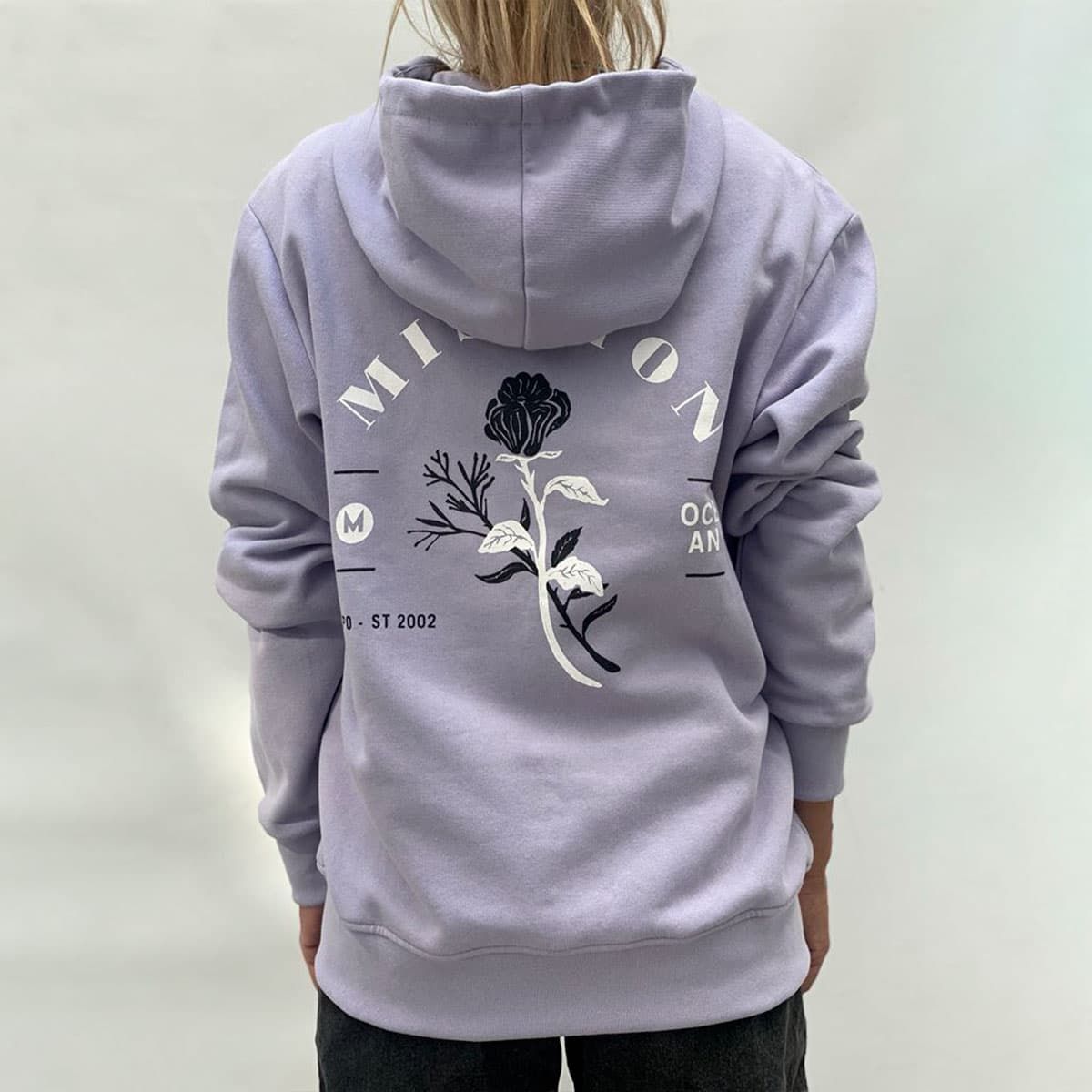 La sudadera con capucha y cremallera Logo Rose lavanda tiene una etiqueta de garantía Mission tejida en el cuello interior y en el bolsillo.