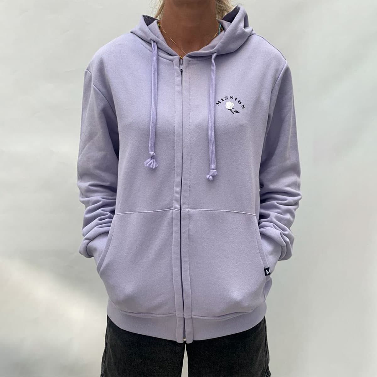 La sudadera con capucha y cremallera para hombre y mujer Logo Rose en tono lavanda (Pale Lavender) de Mission está confeccionada con tejido de larga duración que no encoge de 70% algodón y 30% poliéster reciclado.