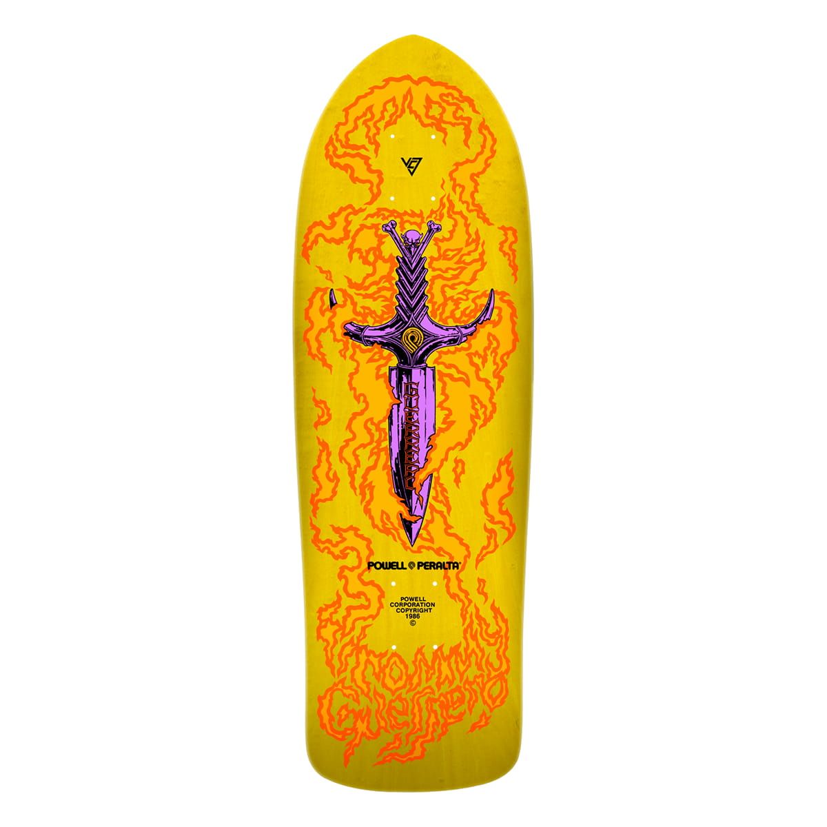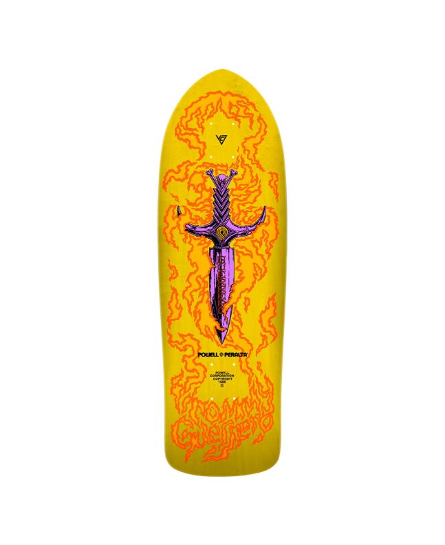 El deck Powell Peralta Bones Brigade Series 15 Tommy Guerrero 9.75" x 30.27" Yellow combina el shape de Guerrero en los años 80 con la madera teñida en color amarillo y gráficos originales de VCJ Vernon Courtlandt Johnson.