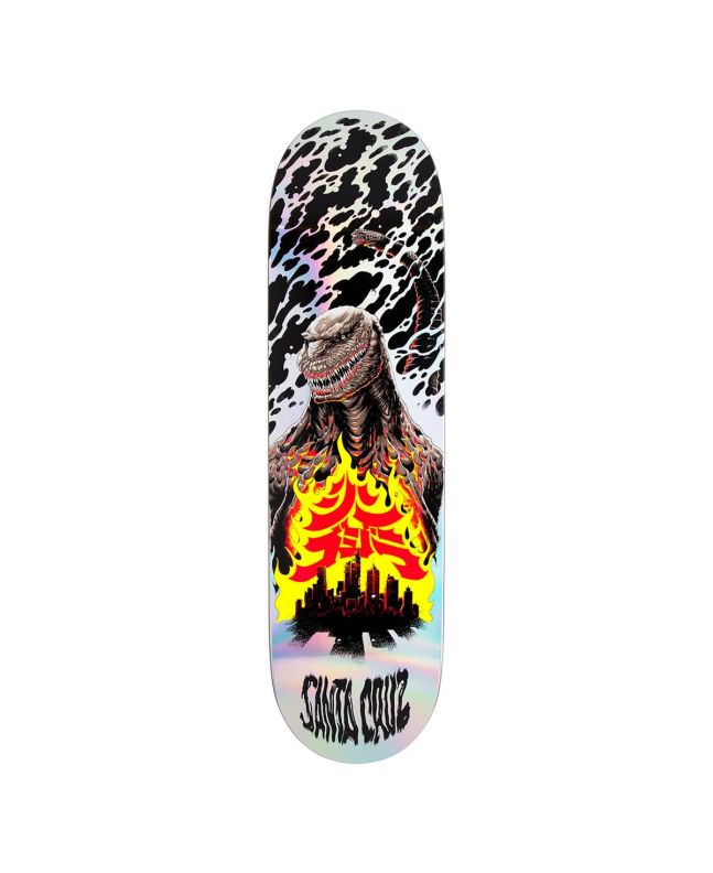 Esta tabla para monopatín de Edición Limitada, perteneciente a la Colección Santa Cruz x Godzilla, cuenta con un gráfico de Godzilla Shin y una hoguera sobre la ciudad con acabado brillante, mientras que en la parte superior tiene el logo de Godzilla grabado con láser e ilustraciones Godzilla vs Santa Cruz.