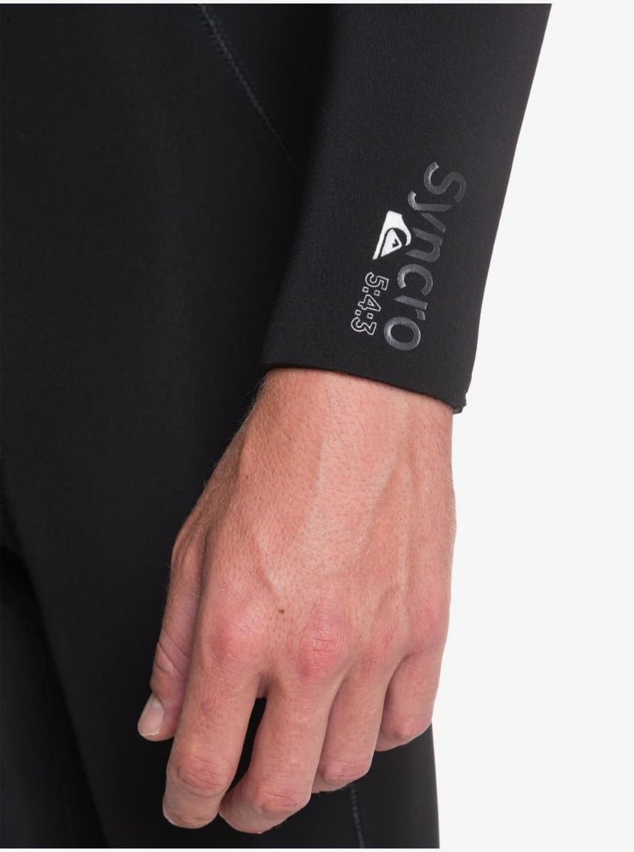 El neopreno integral para hombre Syncro 5/4/3mm Chest Zip tiene el logo de Quiksilver estampado en el pecho, la espalda, el brazo y la manga izquierdos.