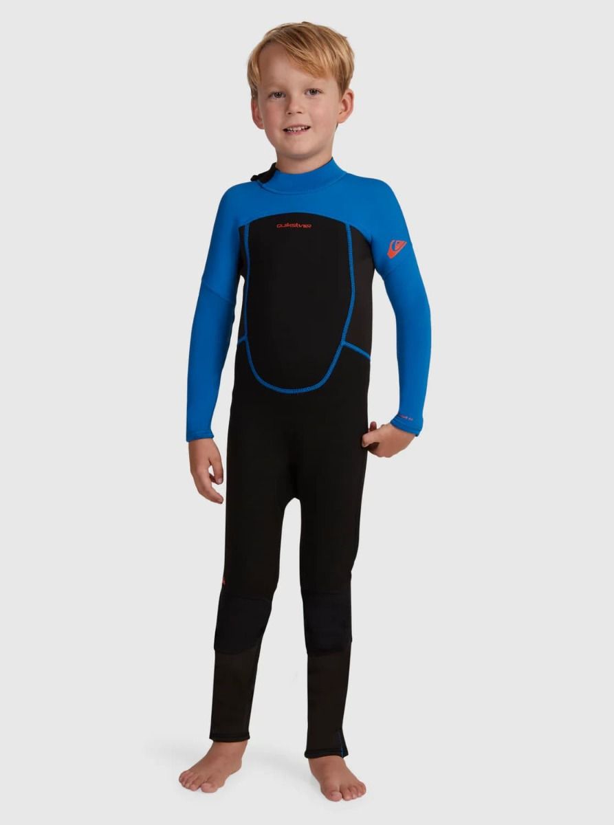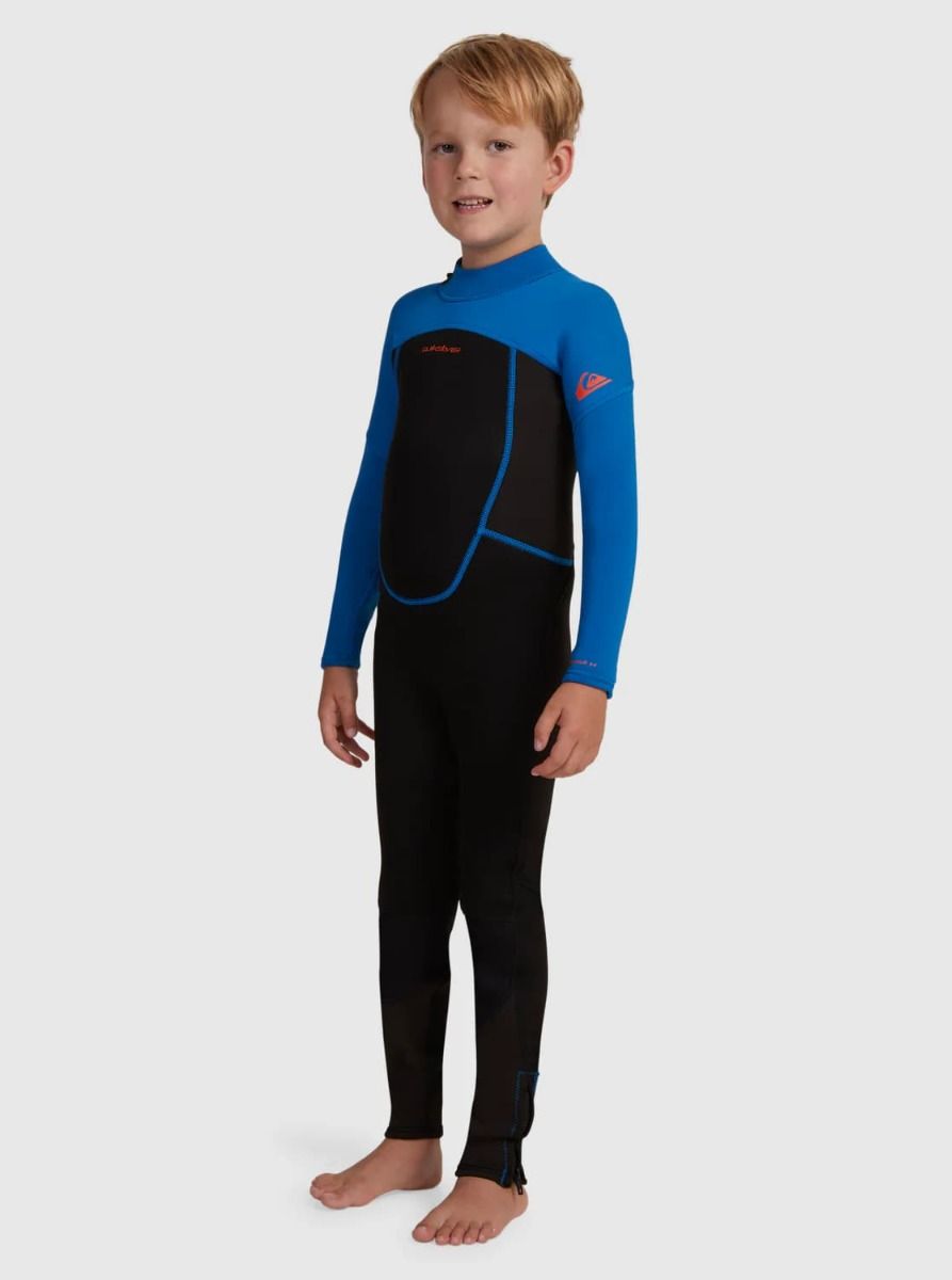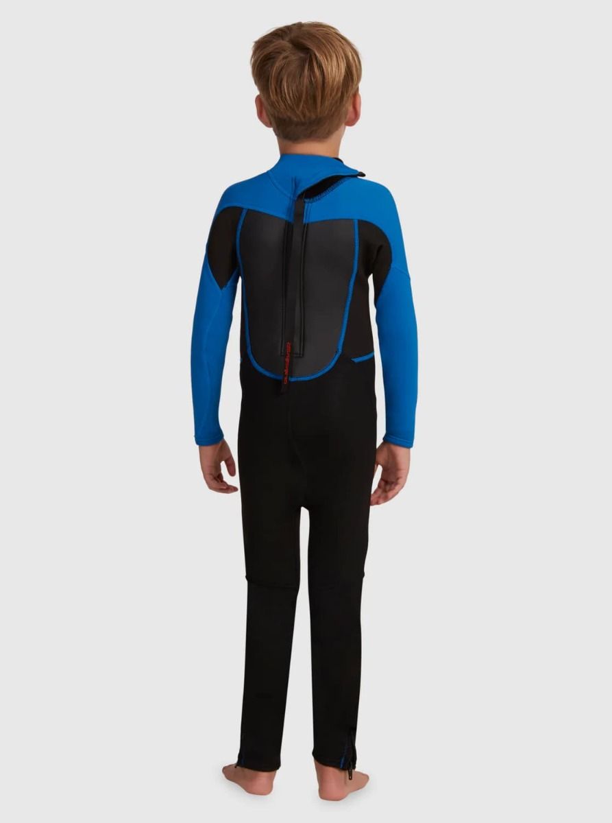 El traje de surf con cremallera posterior para niños de entre 2 y 7 años 3/2mm Prologue Boy Back Zip Wetsuit de Quiksilver en tono negro y azul (Black-Squale Blue) está confeccionado con neopreno *ecológico Freemax y Stretchflight 2 para lograr calor y comodidad sin renunciar a la flexibilidad.