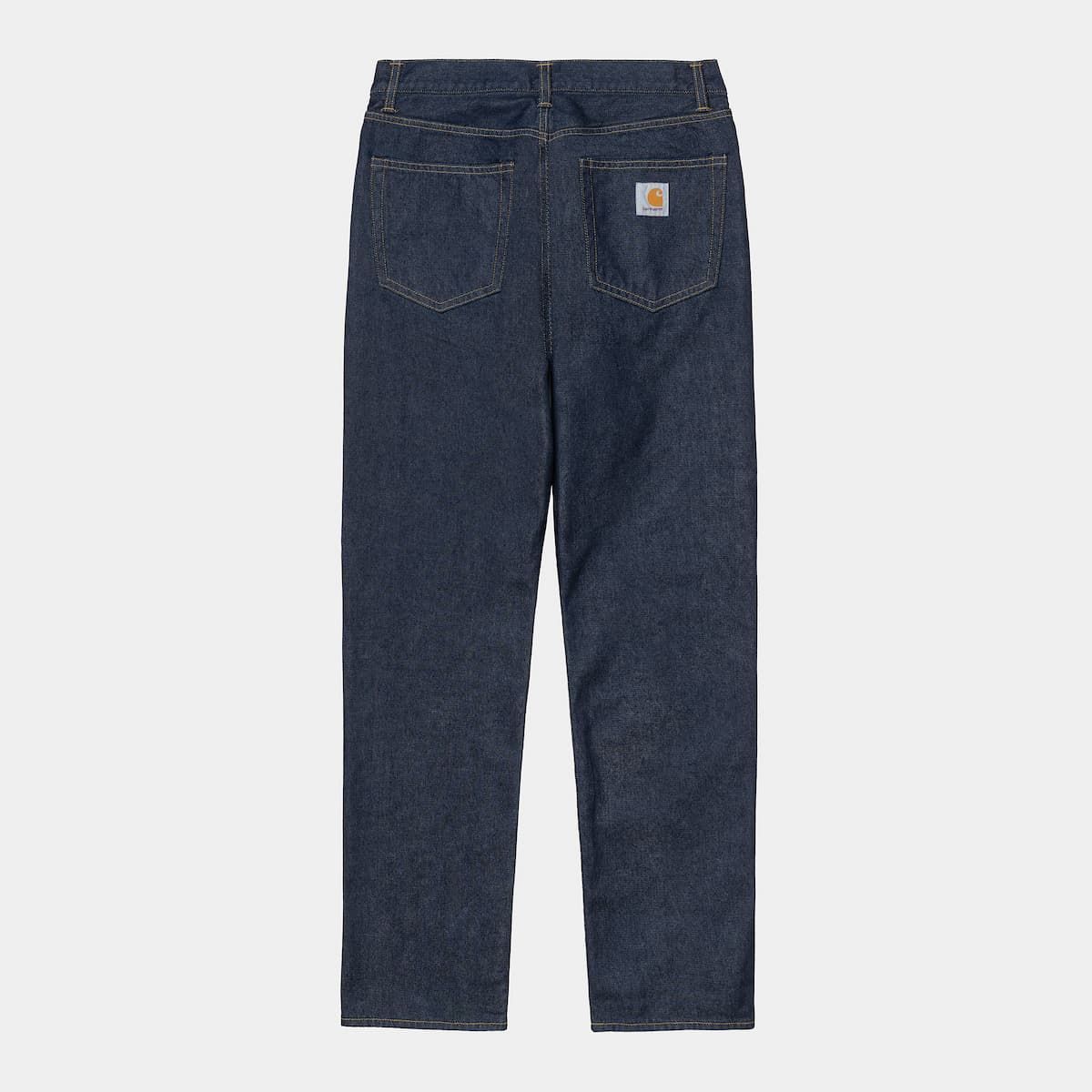 El pantalón vaquero Pontiac Pant azul (One Wash) para hombre tiene una etiqueta de garantía de Carhartt Work In Progress cosida en la cintura.