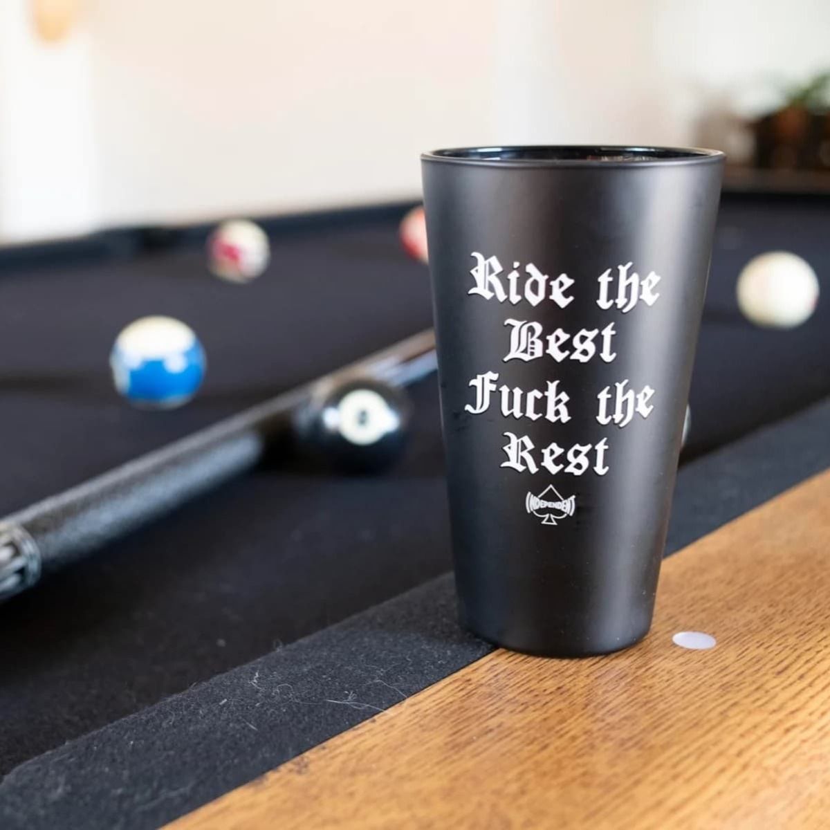 Fabricado en vidrio negro esmerilado, este vaso de 16 oz presenta el emblemático Warpig de Motörhead en el frente y el lema clásico de Independent Ride the Best, F** the Rest* en el reverso.