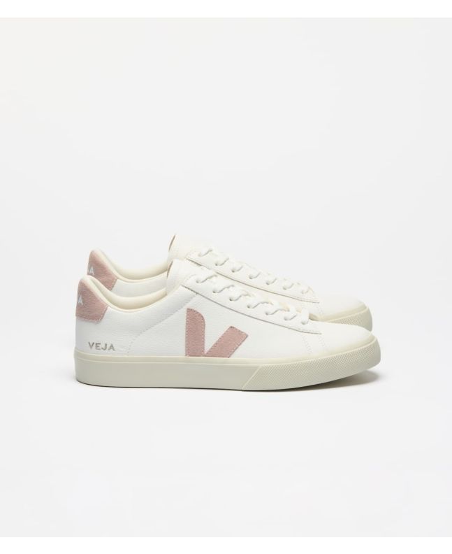 Las zapatillas de cuero para mujer y hombre Campo Chromefree Leather en blanco con detalles en tono rosado (Extra White Babe) de Veja son un calzado elegante, a la vez que respetuoso con el Medio Ambiente.