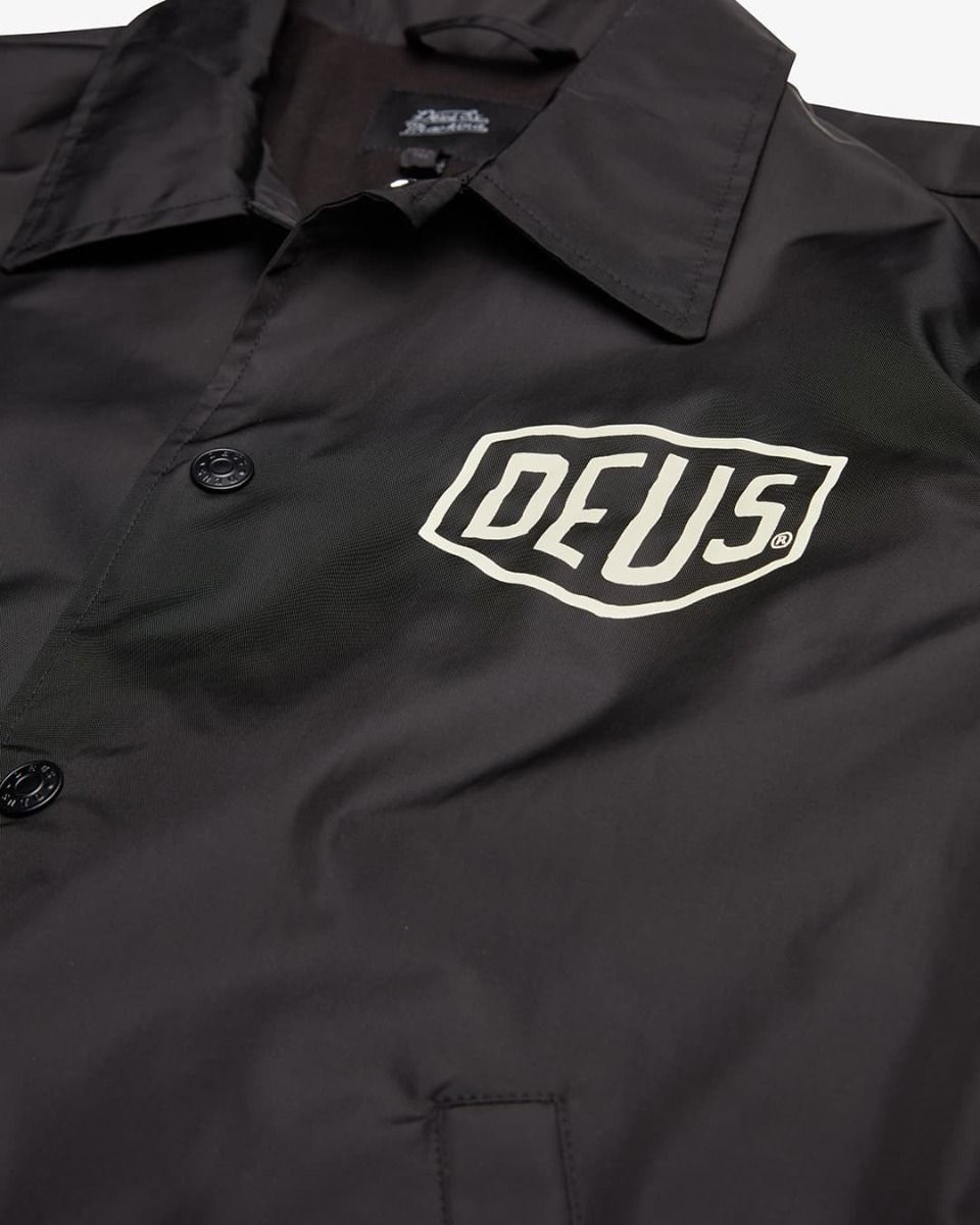 Chaqueta técnica Deus Venice Coach negra para hombre con cierre a presión, exterior cortavientos y gráficos icónicos Venice. Ya disponible en Mission Surf Shop.