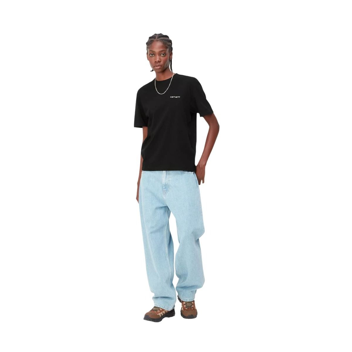 Luce el inconfundible estilo de Carhartt Work In Progress con la camiseta de manga corta W' Script Embroidery SS color Negro-Blanco para mujer.