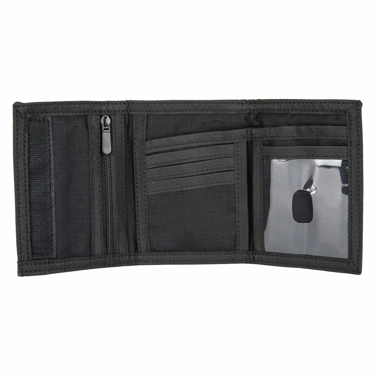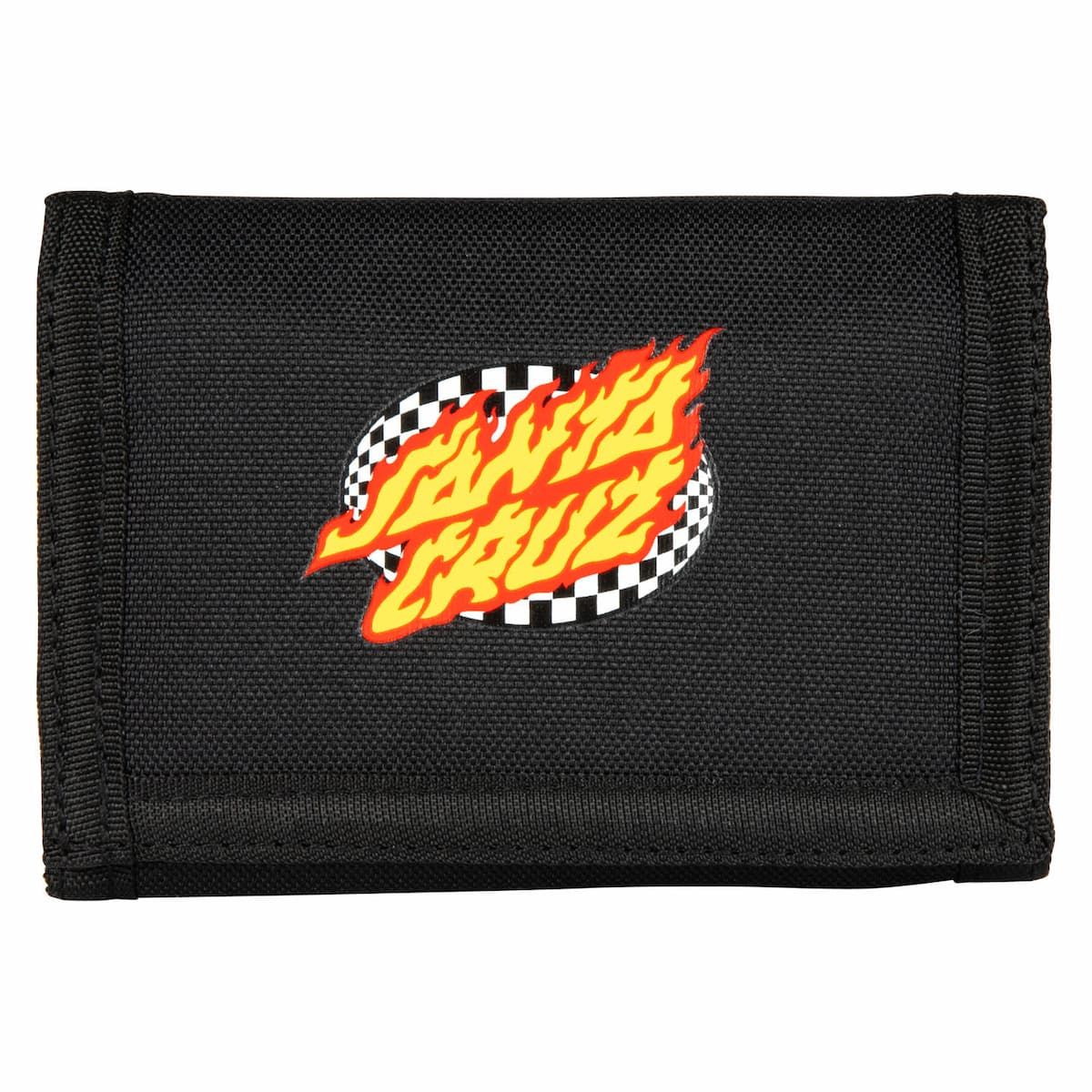 Esta cartera con diseño de triple pliegue viene con cierre de velcro, bolsillo interior para monedas con cremallera, ranuras para tarjetas y billetes, ventana de identificación y el logo de Santa Cruz en llamas junto con un aro Check estampado en la zona frontal.