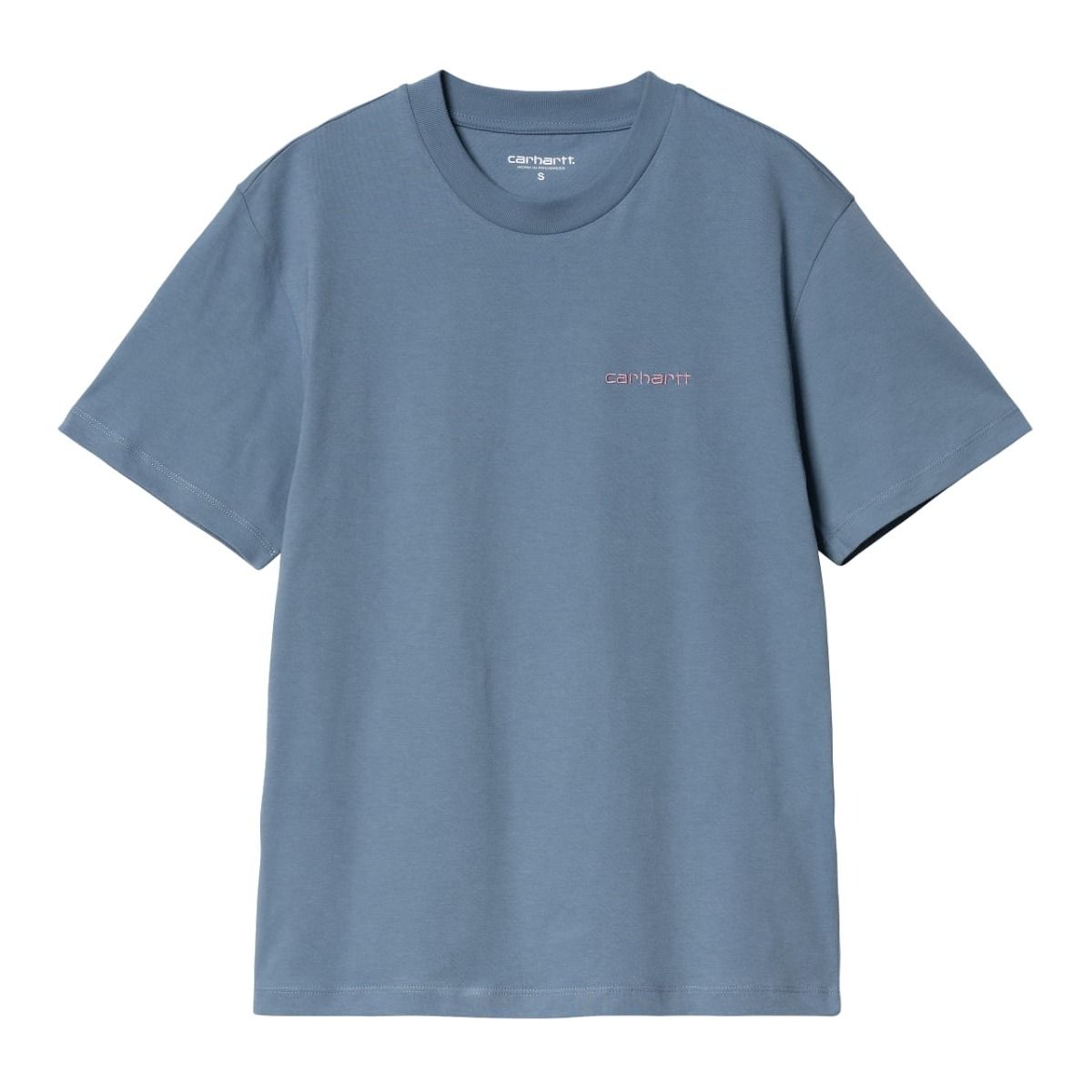 Luce el inconfundible estilo de Carhartt Work In Progress con la camiseta de manga corta W' Script Embroidery SS Azul y Rosa para mujer.