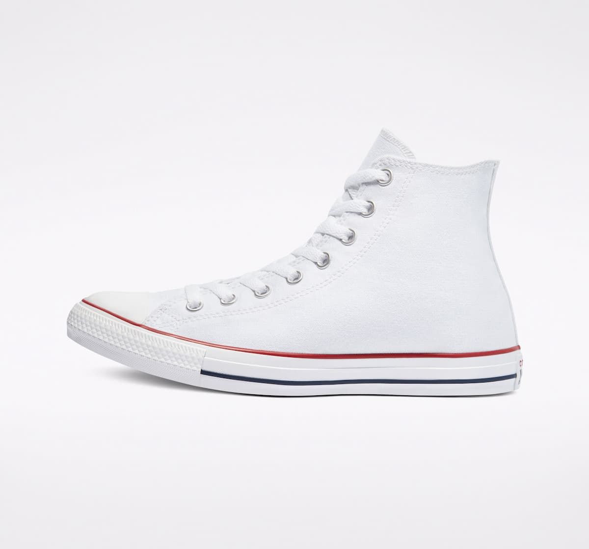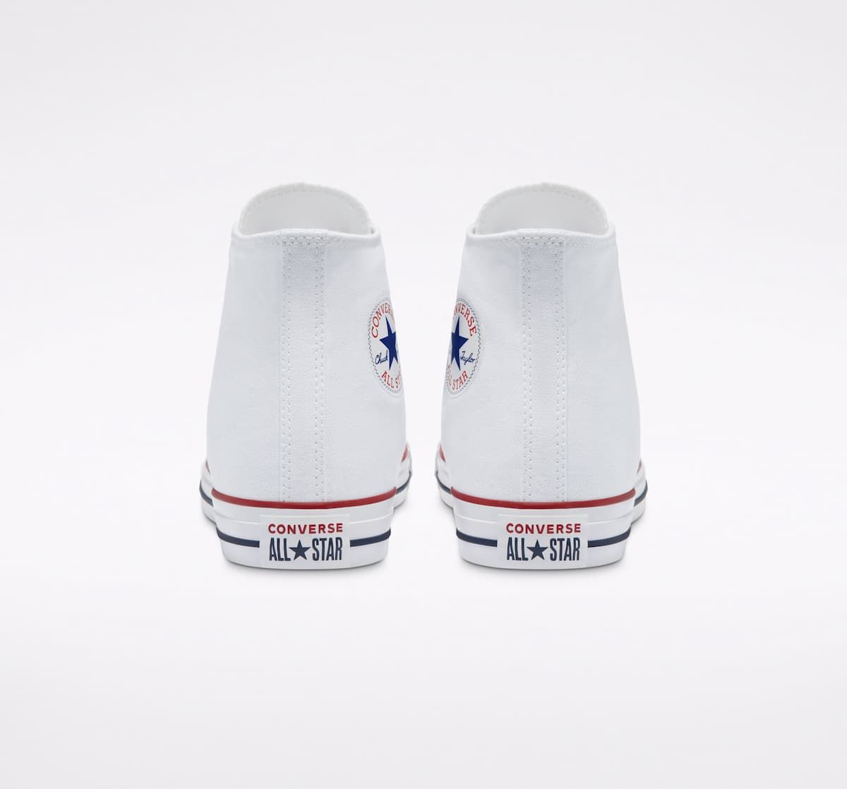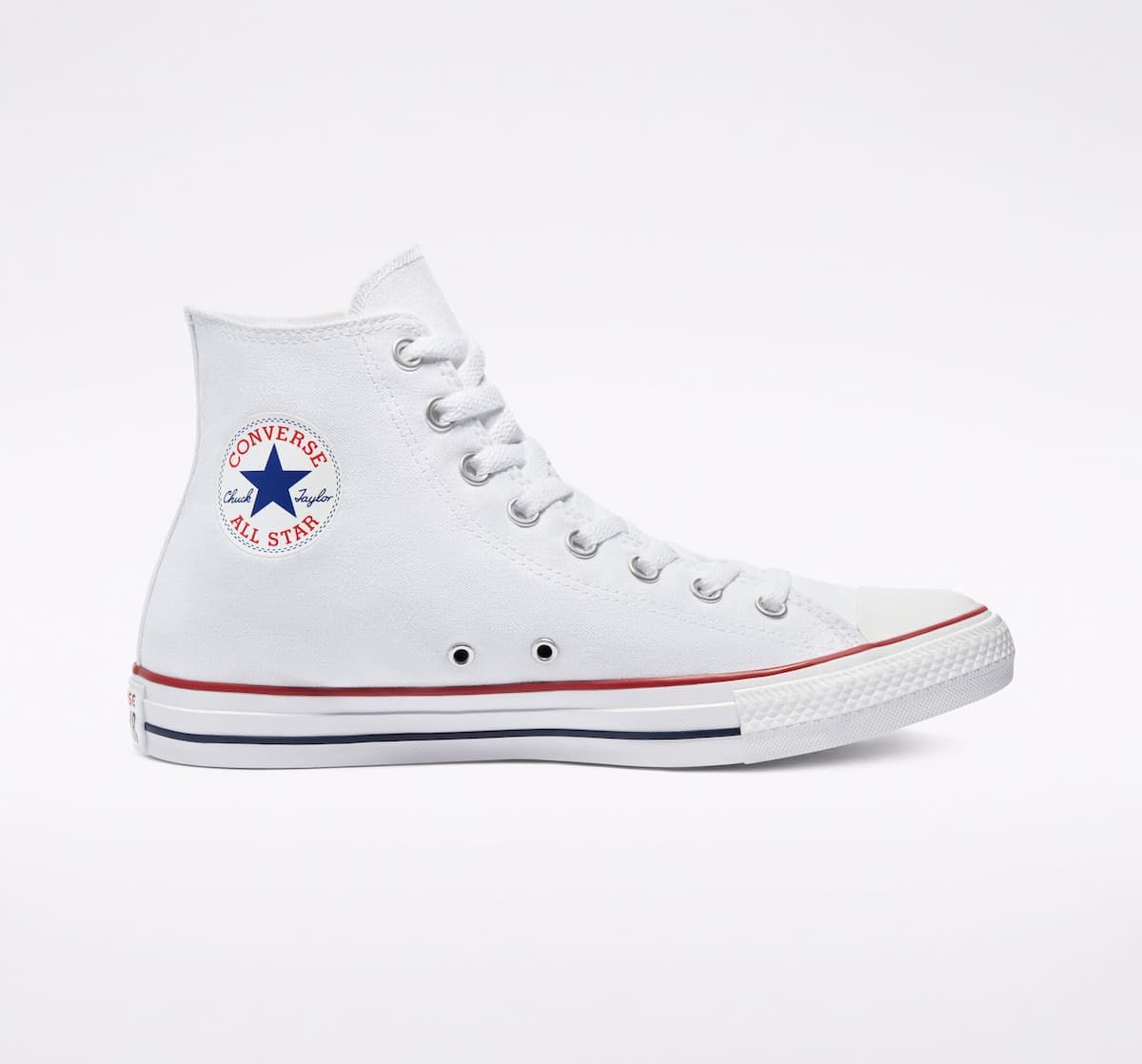 Las clásicas Chuck Taylor All Star Hi blancas cuentan con corte alto, parte superior de lona transpirable, ligera y resistente, dos agujeros metálicos en el laterales para mayor transpirabilidad, cierre de cordones, puntera de goma reforzada, el clásico parche All Star en el tobillo y suela de caucho vulcanizada.