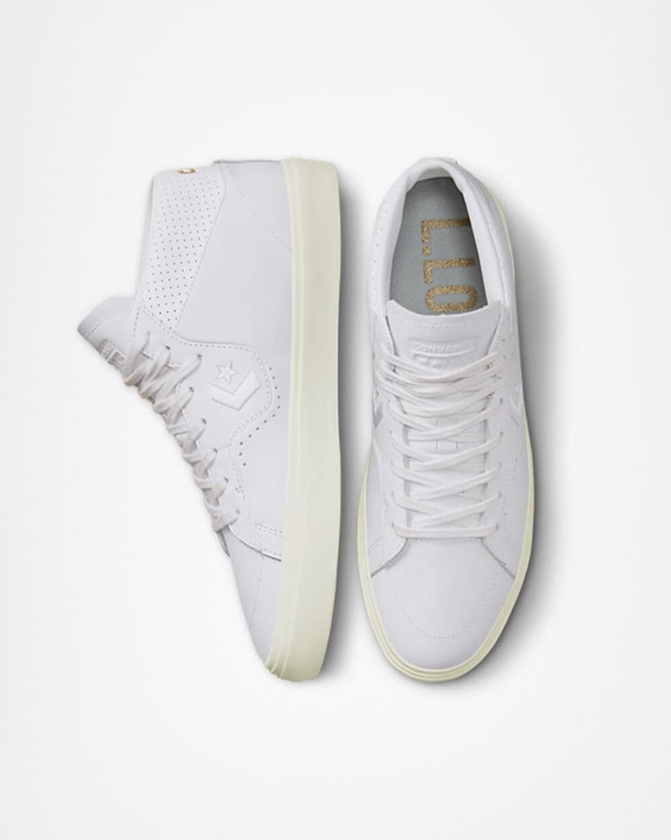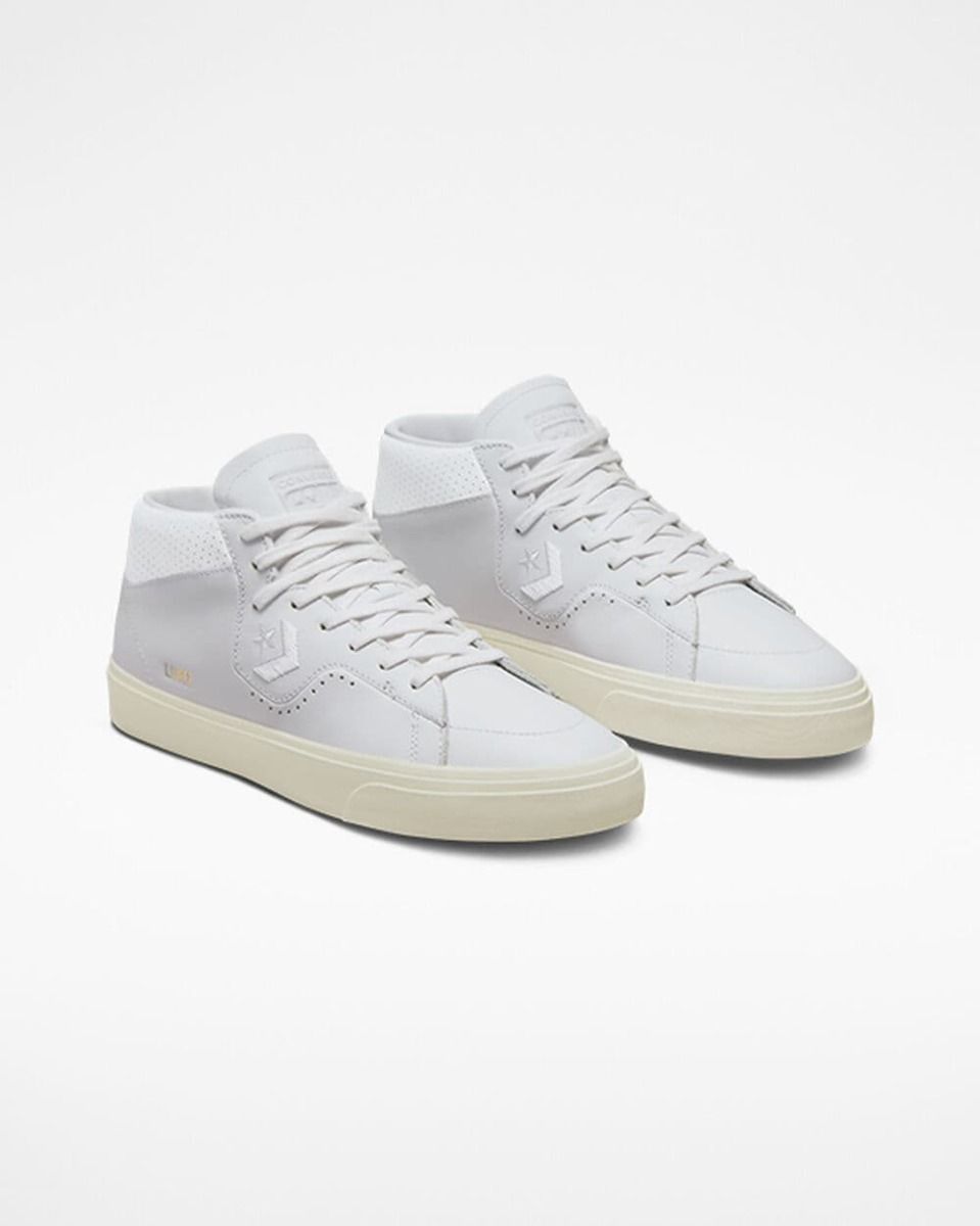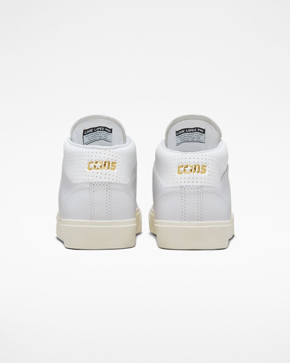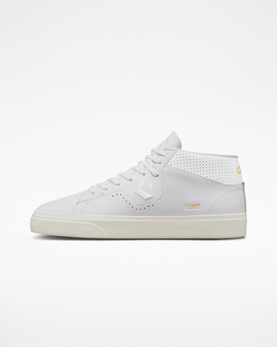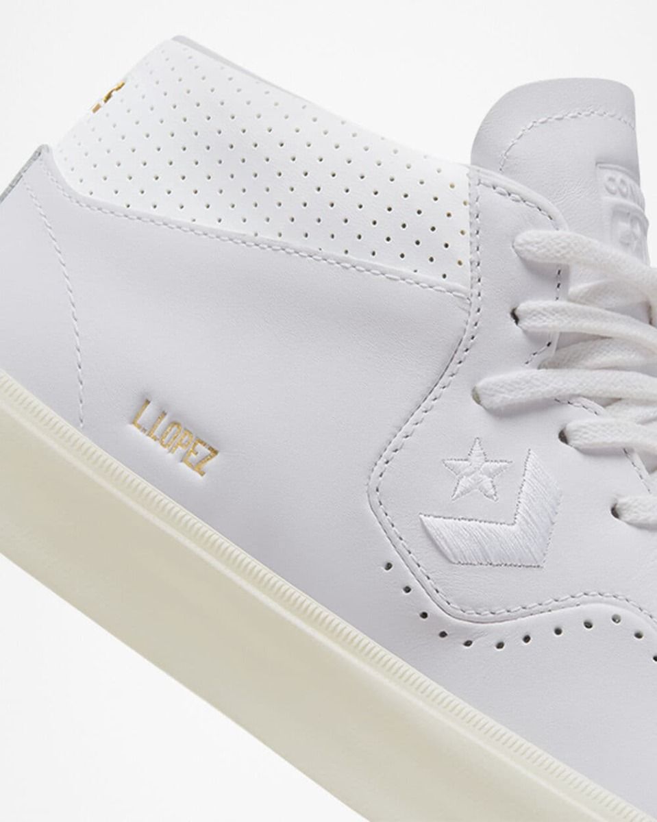 Las zapatillas de skaeboard para hombre CONS Louie Lopez Pro Mid Mono Leaher en blanco con los laterales de la suela en tono garza (White/White/Egret) de Converse están confeccionadas con piel de calidad Premium.