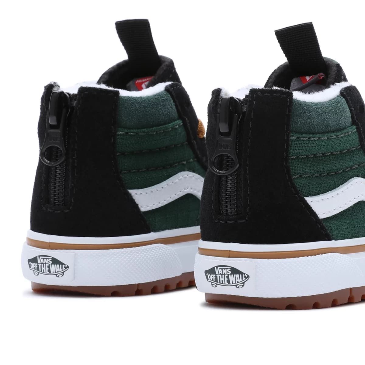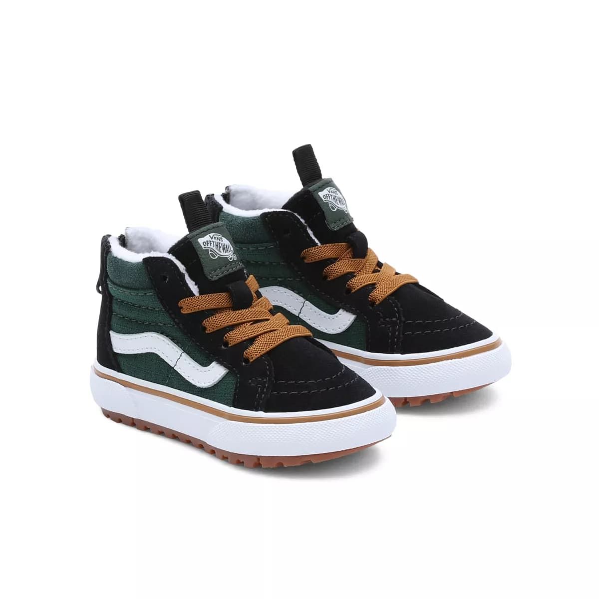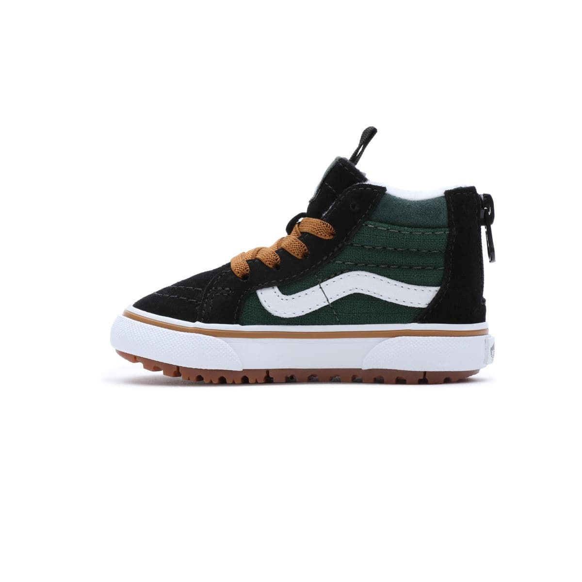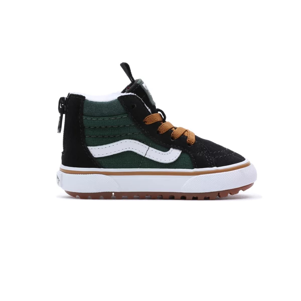 Las deportivas infantiles TD Sk8-Hi Zip MTE-1 Ripstop negras y verdes cuentan con palas resistentes al agua con revestimiento Hydroguard™ para una impermeabilización fiable, cómoda y transpirable, aislante zonal Primaloft® con sistema de aislamiento térmico de microfibra de alta calidad, puntadas estratégicas para ofrecerte la máxima versatilidad, una cremallera en el talón para ponerlas y quitarlas fácilmente, plantilla ligera de EVA Moldeada UltraCush™ de una sola capa para mayor comodidad y la suela con tacos MTE-1 de Vans con bandas de rodadura multidireccionales para un agarre óptimo en condiciones húmedas.