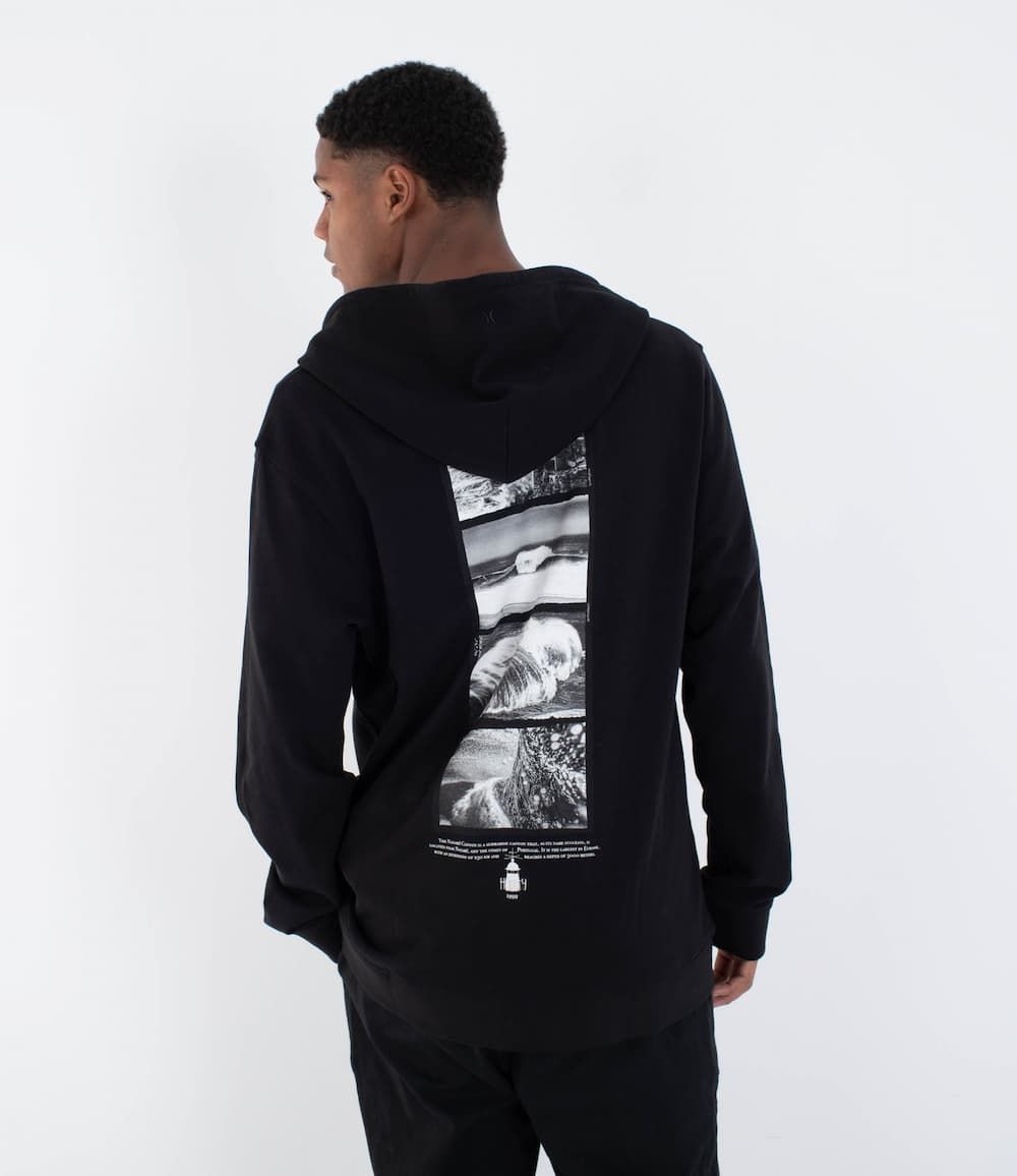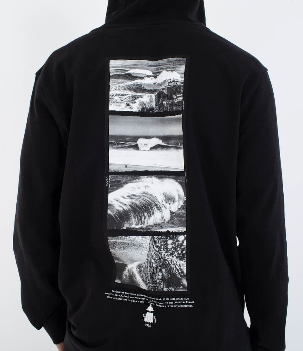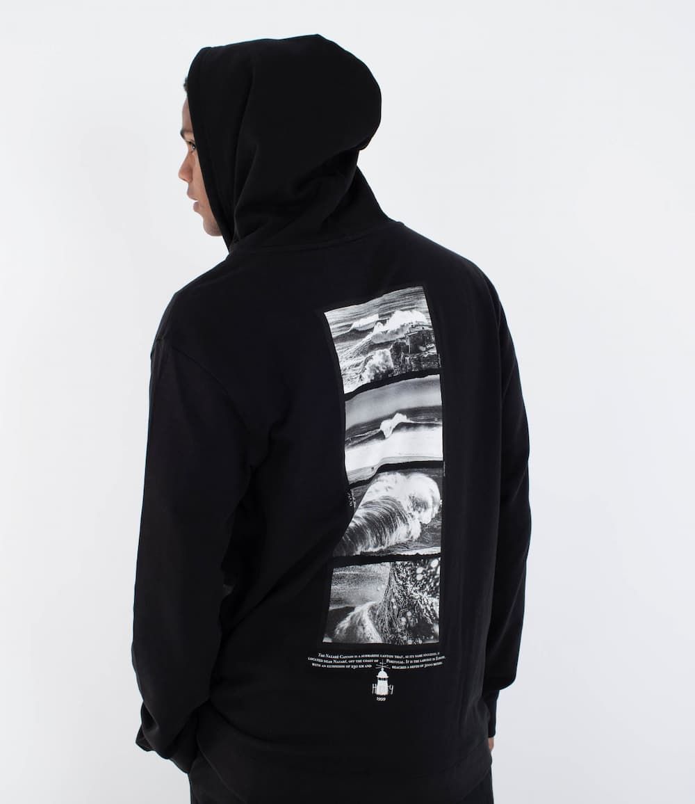 La espalda incorpora un montaje fotográfico en blanco y negro con escenas icónicas de olas gigantes rompiendo contra el acantilado y el faro de Nazaré. Bajo el gráfico, se incluye una descripción en inglés del "Nazaré Canyon", reforzando el vínculo técnico y simbólico con uno de los spots más extremos del planeta. El logotipo de Hurley con el faro aparece también impreso en la parte frontal, añadiendo identidad a cada detalle.